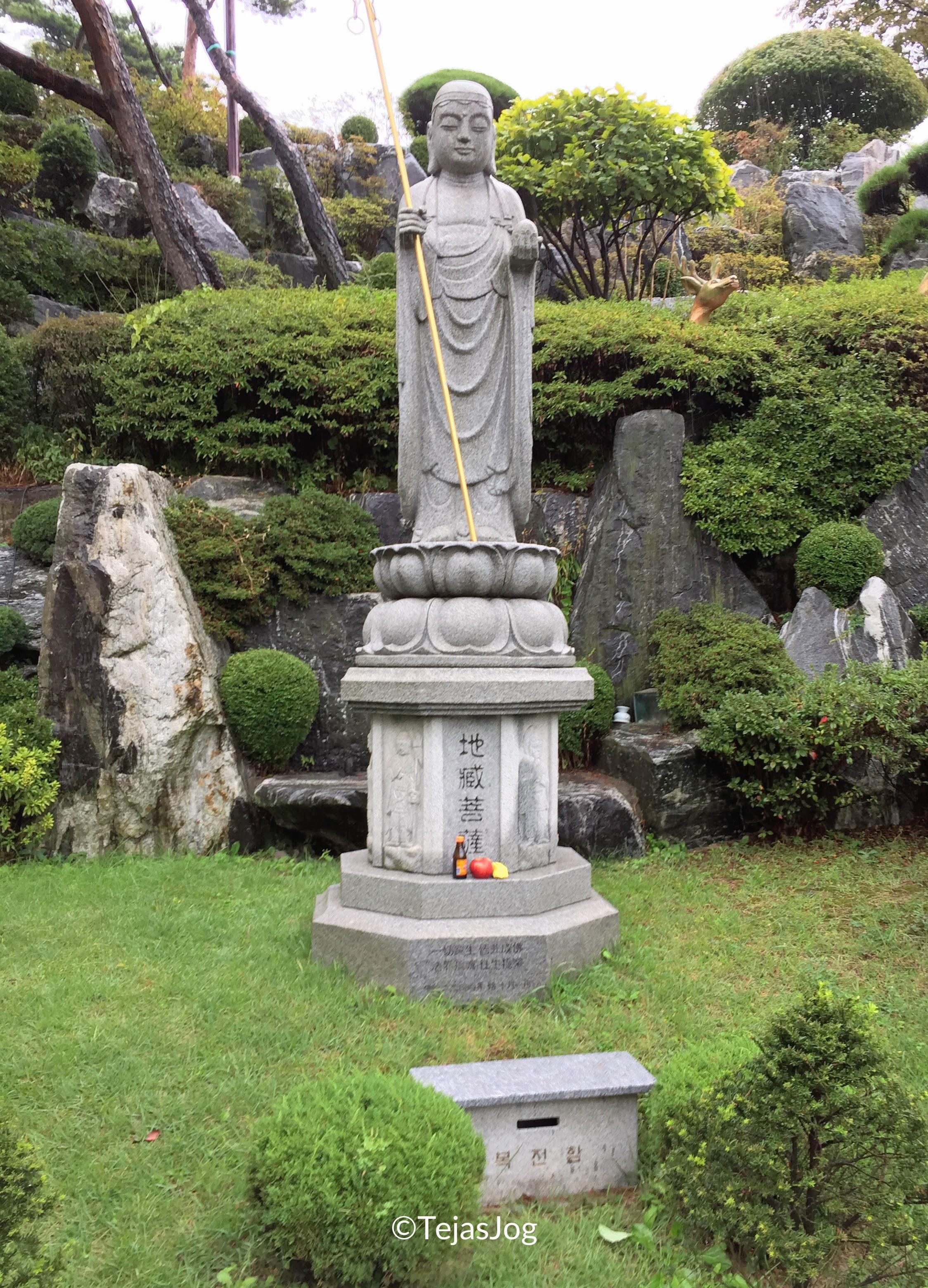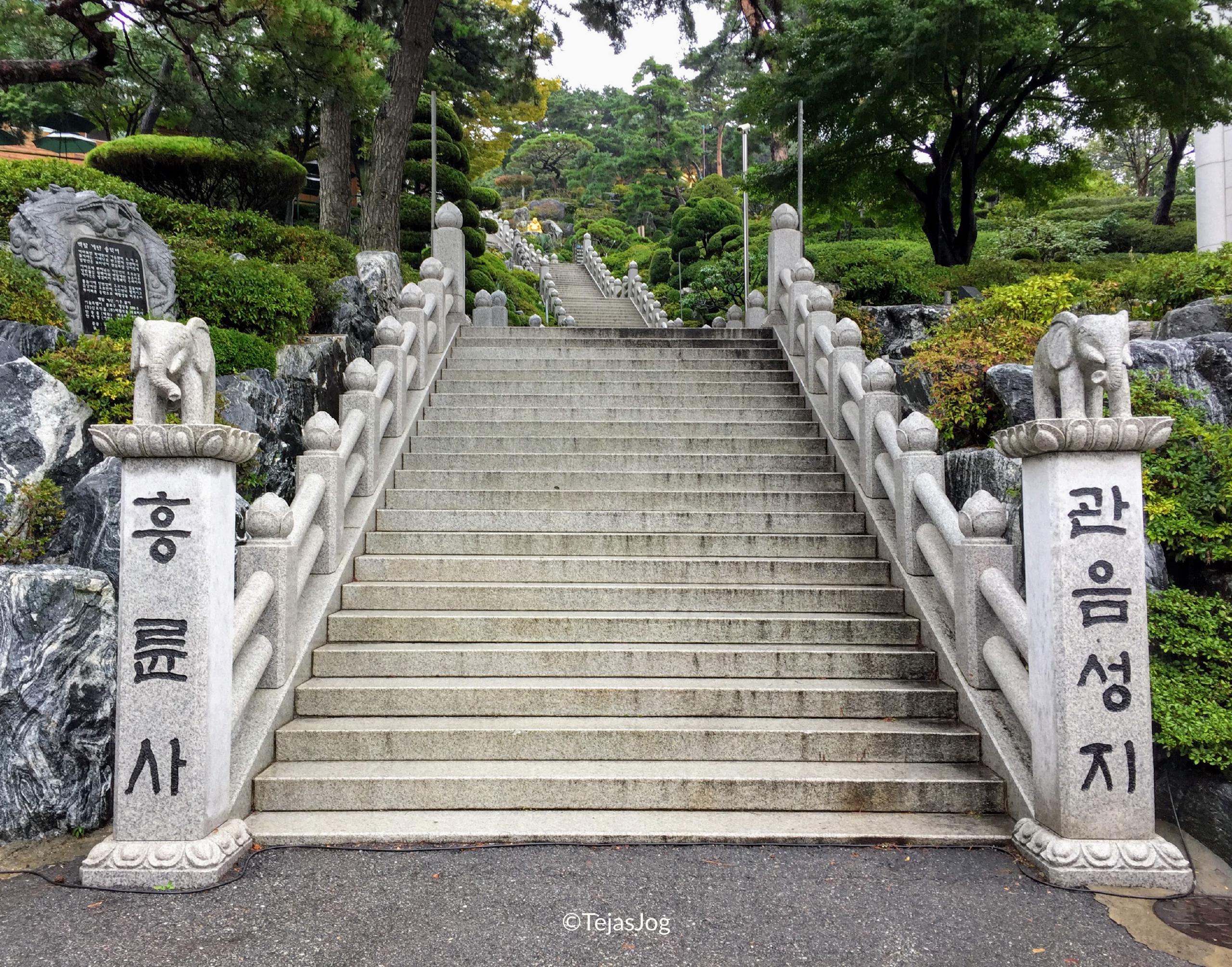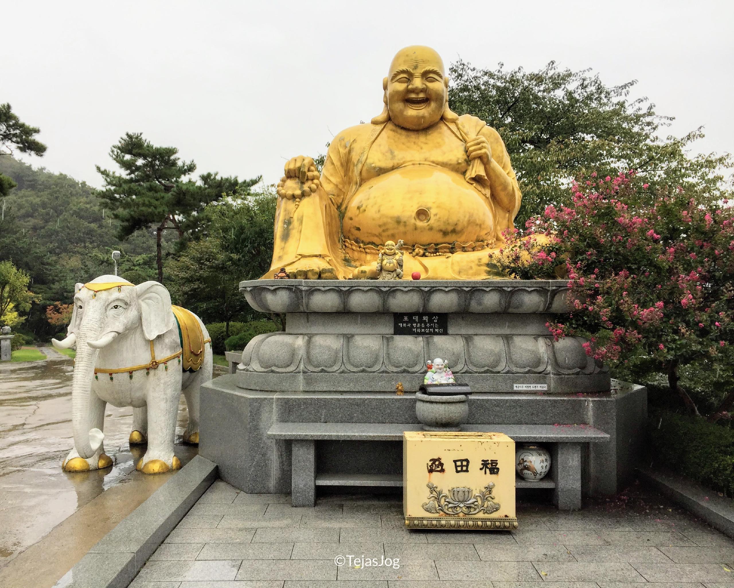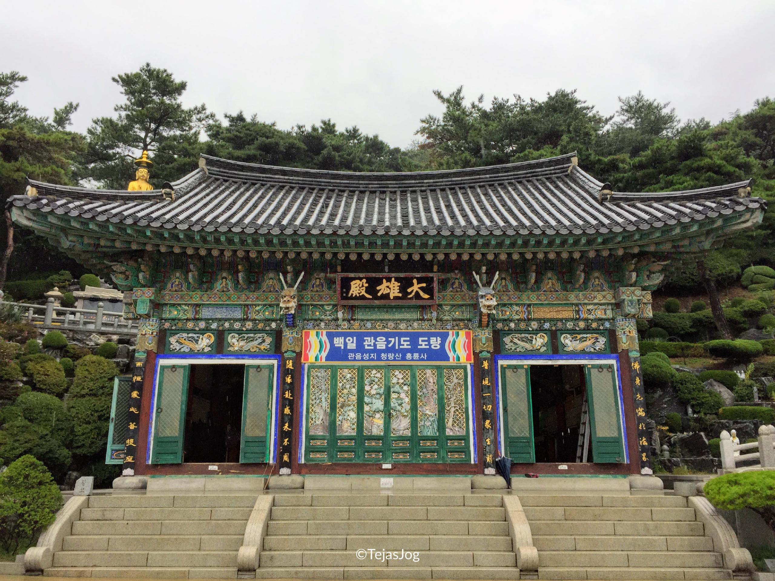 At the time of departure I found out I was the only one on the bus, but the tour still went ahead as scheduled. I met the tour guide and the driver and we were on our way. We drove over the Incheon Bridge, South Korea’s longest spanning cable-stayed bridge. The first stop was the Heungryunsa Temple. The weather was wet, but not cold. The bus also had umbrellas for the passengers to use. So there was no problem in walking around. I spent about an hour roaming around the temple grounds and the landscaped gardens.