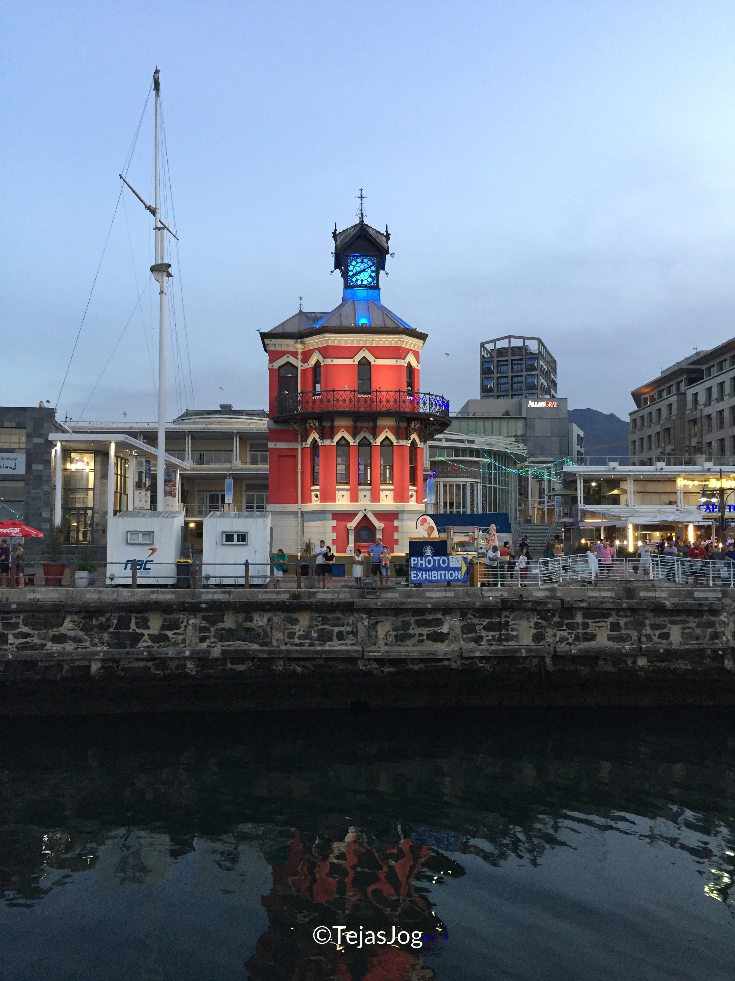 We took a taxi to the Victoria & Alfred Waterfront in the evening. We could see the sun setting behind Table Mountain in the distance.