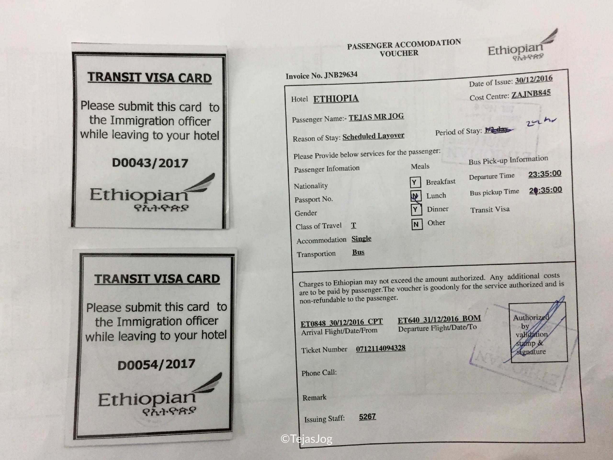 After the wonderful Pilanesberg Safari yesterday, our overnight flight ET 848 from Johannesburg to Addis Ababa landed around 6:00 AM. We were already given a Passenger Accommodation Voucher at Johannesburg airport and at Addis Ababa we also got the transit visa card.