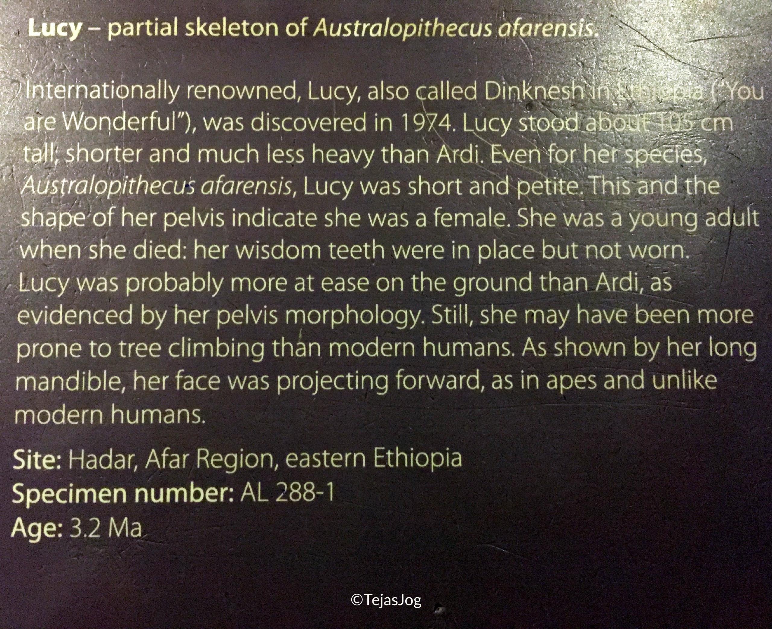 The main draw was the fossilized remains of early hominids, the most famous of which is “Lucy”, the partial skeleton of a specimen of Australopithecus afarensis.