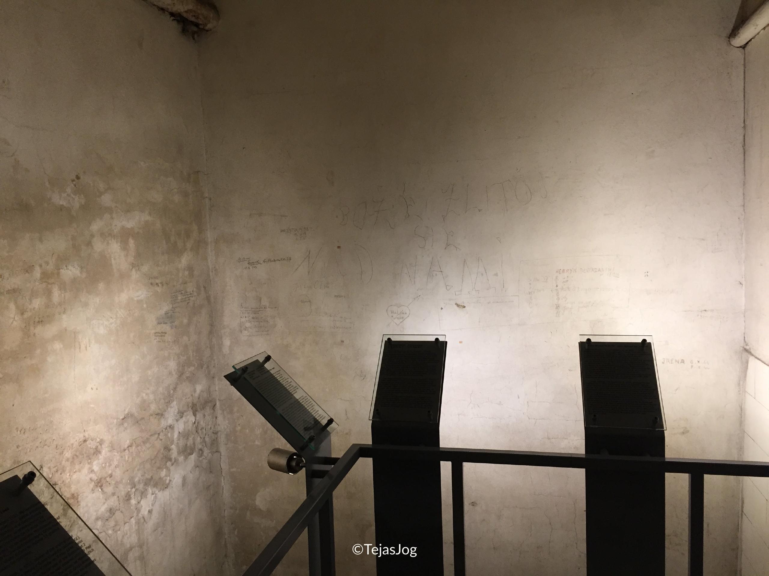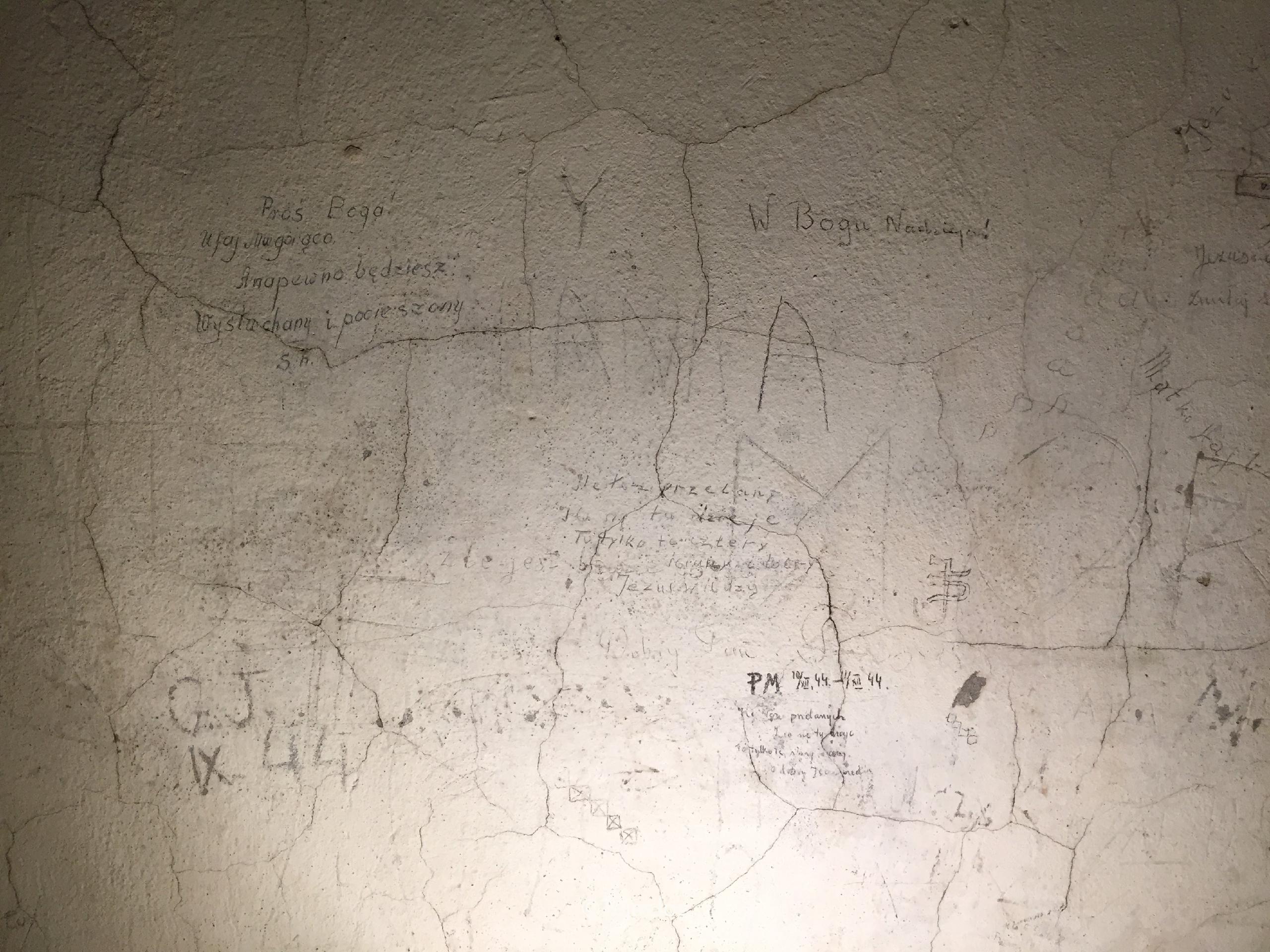 Our last stop was the Gestapo headquarters in Krak贸w. The Gestapo was the Nazi Secret State Police and one of the main tools used by the fascists to exterminate the Jews and to imprison Poles and other nationalities that did not share their political ideals. The main highlights there were the old cells where the Gestapo would interrogate their prisoners. We could still see the engravings made by the prisoners on the filthy walls that demonstrate the ordeal they suffered.