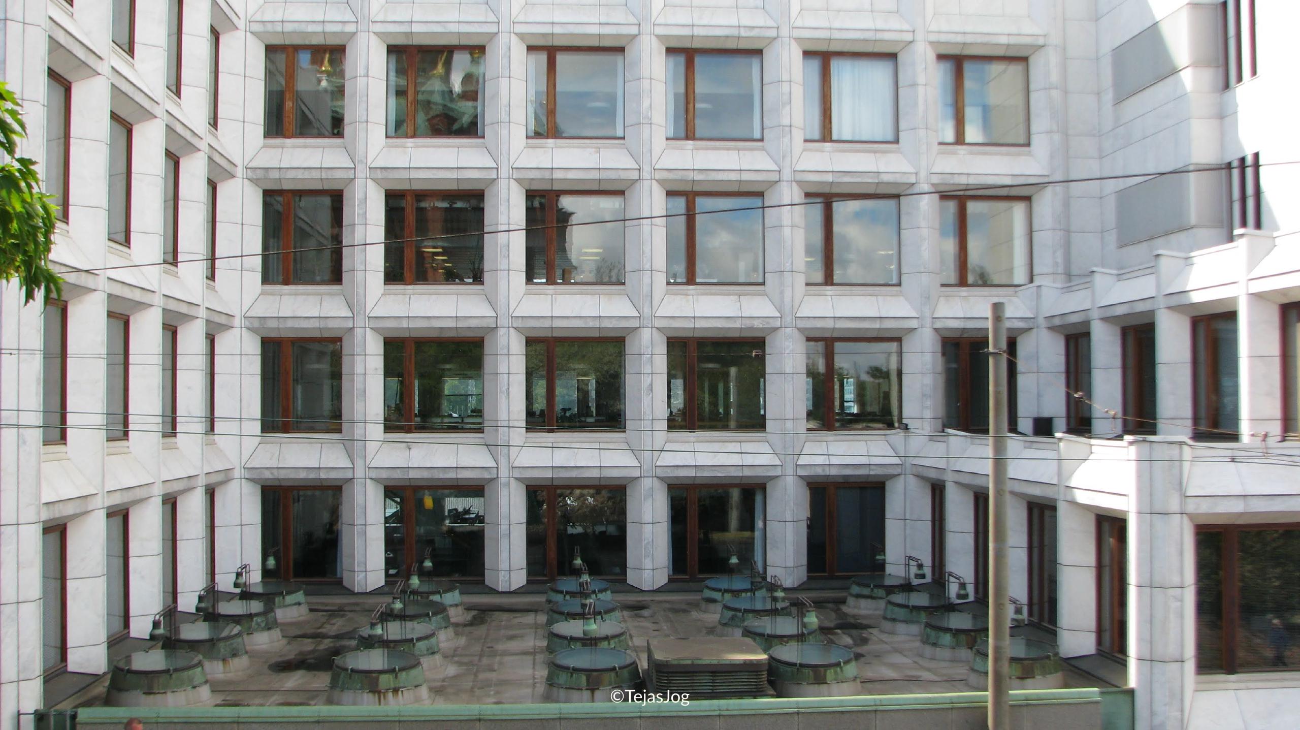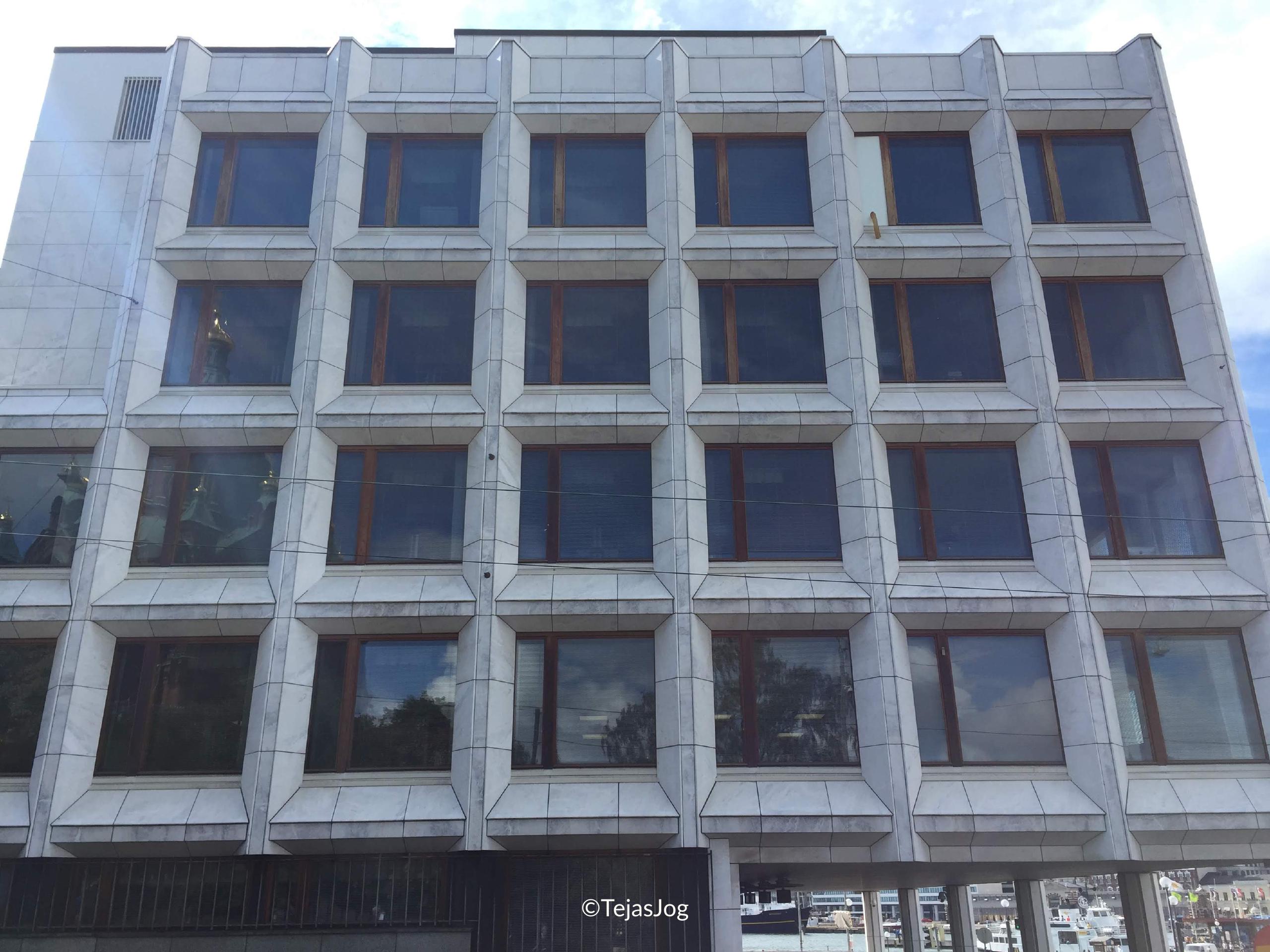Then we crossed the Love Bridge and saw the Enso-Gutzeit office building, designed by Alvar Aalto. The façades are clad with white and grey-blue Carrara marble.
