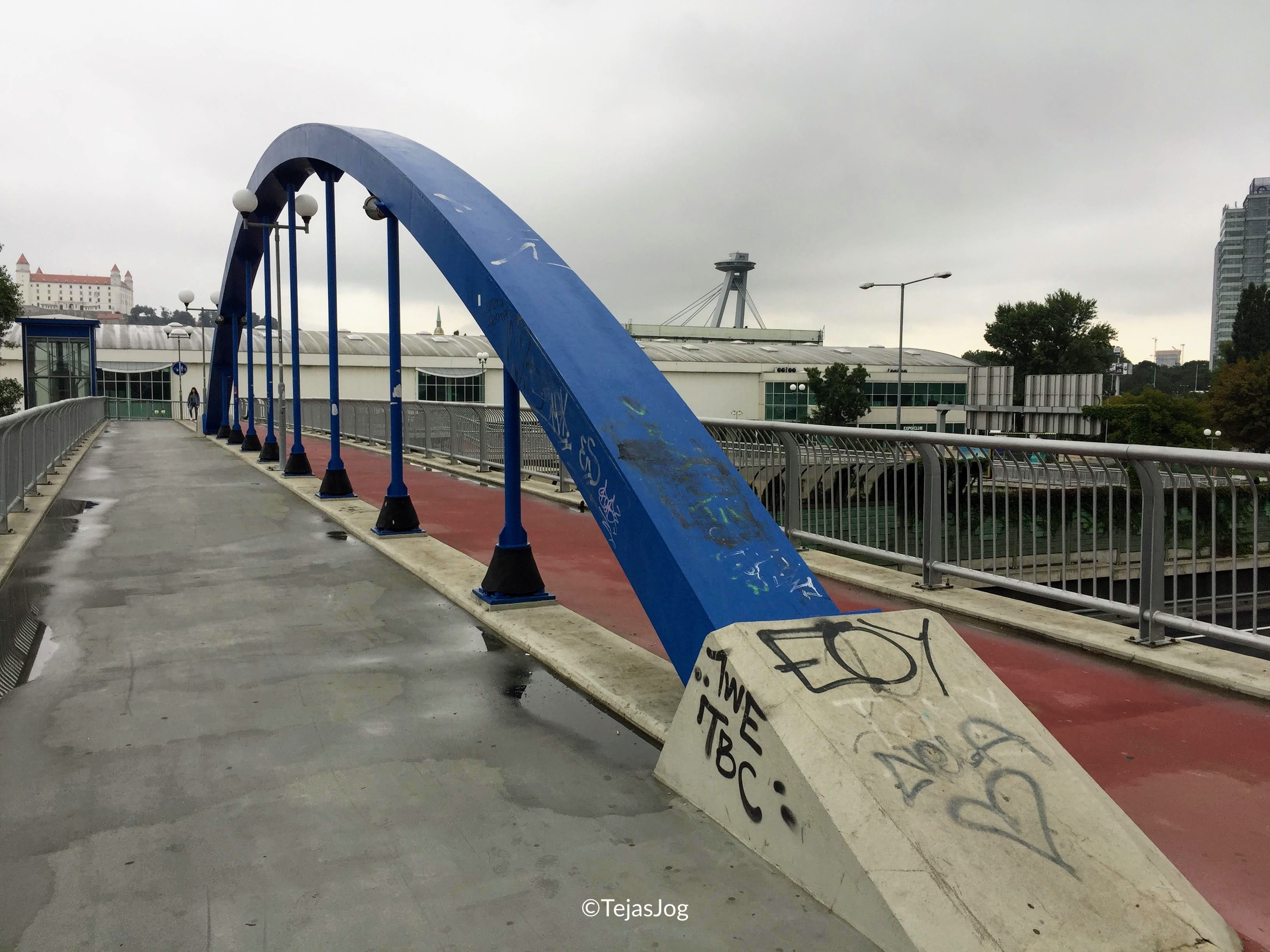 Most of the ride was through the Austrian countryside, and we crossed into Slovakia shortly before reaching the city. I alighted at the Einsteinova bus stop and walked across the Most SNP (Slovak National Uprising Bridge). It is impossible to miss the UFO Observation Deck perched atop the bridge pylon, looking like a flying saucer hovering over the Danube. Walking across the lower level of the bridge offered a fantastic view of Bratislava Castle standing guard on the hill.