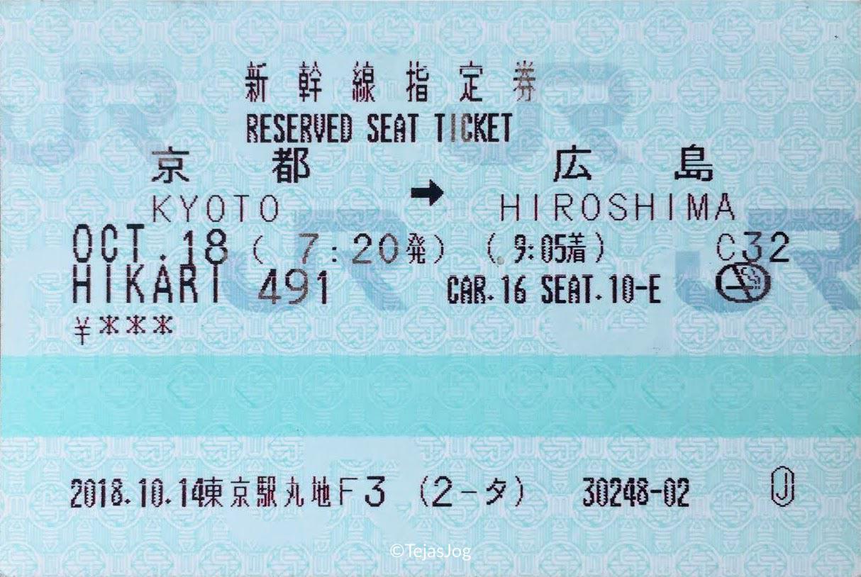 | SHINKANSEN HIKARI 491 | 07:20 | KYOTO | 09:05 | HIROSHIMA | 380.6 | ¥6,600 |