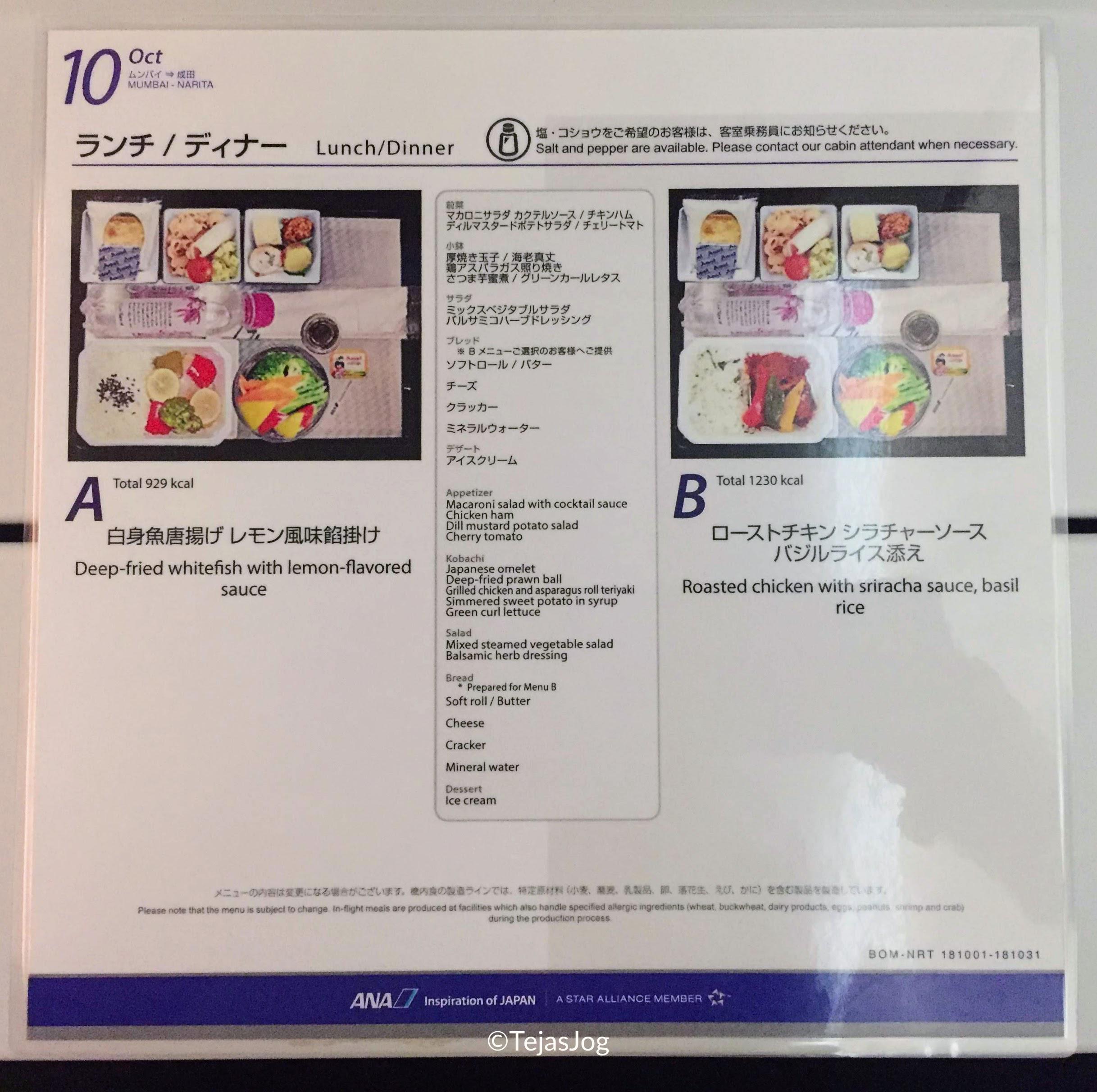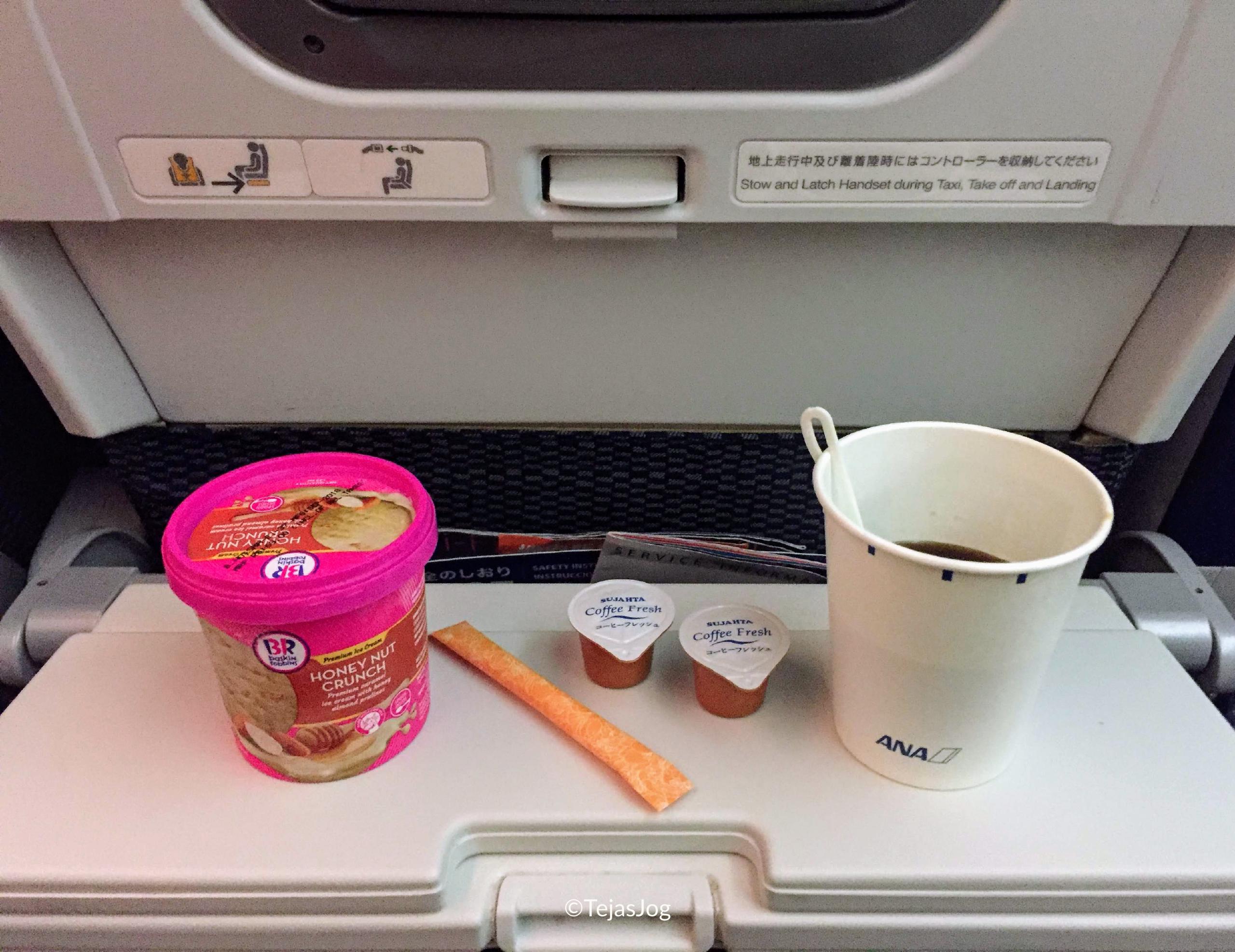 After take off, the flight attendants stood at the front of each cabin and started by bowing down to the passengers. This was our first taste of Japan. Service was prompt, and we were handed out a laminated menu card with the details and the picture of the meal options. After the dinner we were offered ice cream and coffee. Having the three seats for each of us, we were able to lie down and get good sleep before arrival.