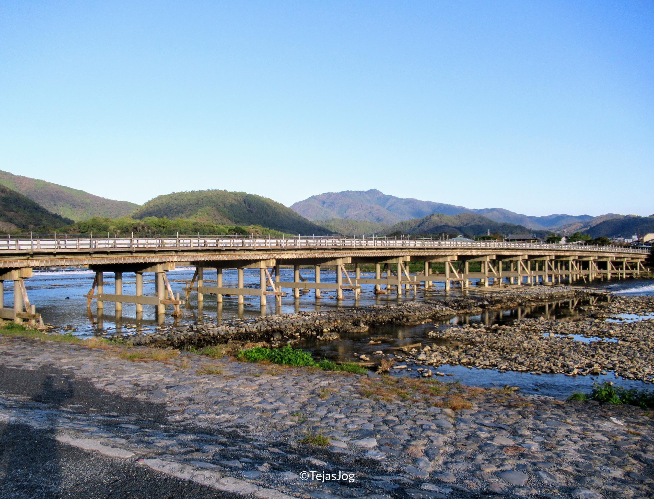 Next we walked to the Togetsukyo Bridge, a 155-meter bridge built across the Katsura River that flows through Saga Arashiyama. A small dam and the tree-covered slopes of the Arashiyama mountain were just south of the bridge. It was wonderful to see this in the early morning light.