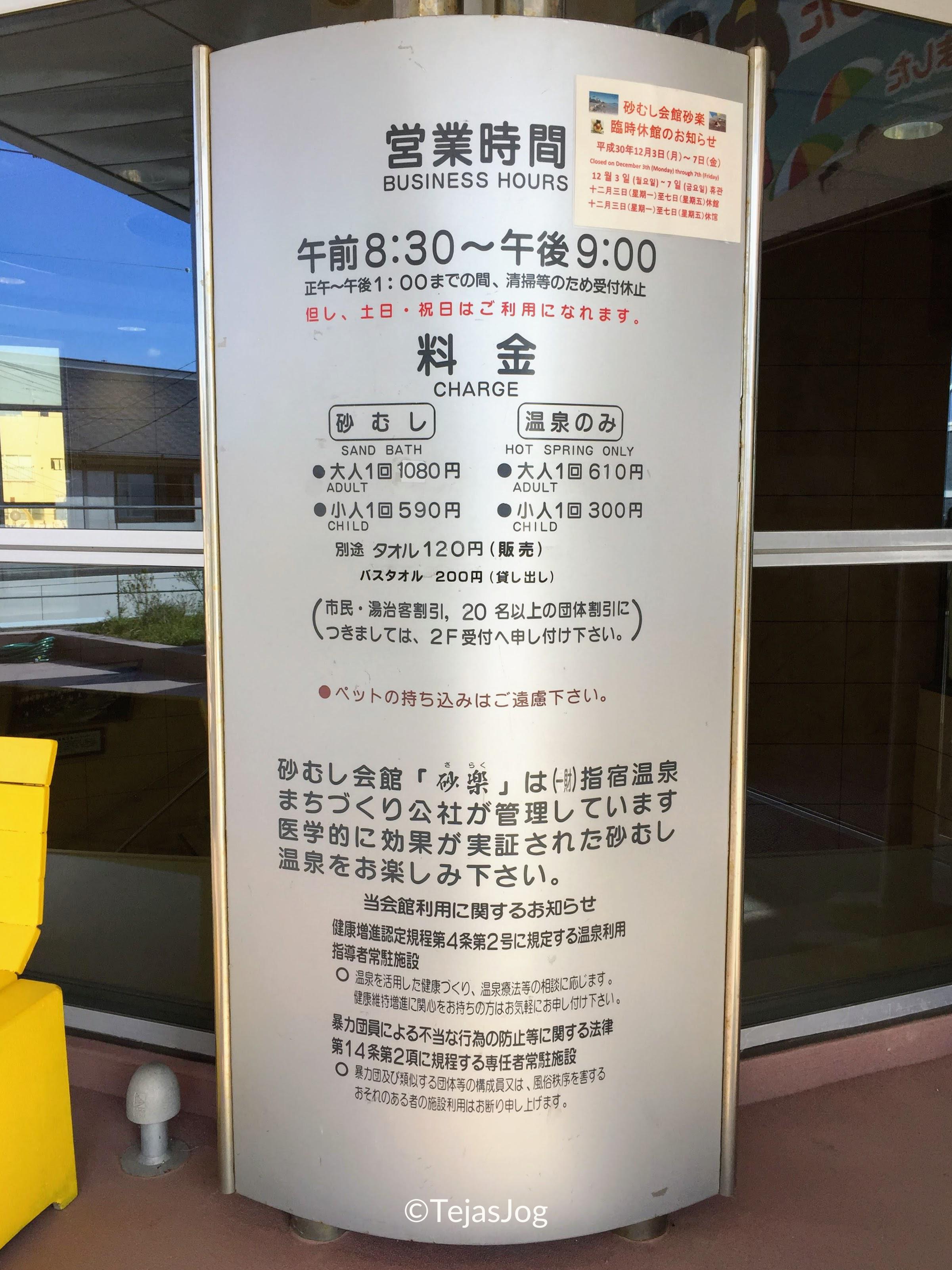 Ibusuki’s claim to fame was sunamushi or sand bath. It is the only place, not just in Japan, but in the entire world where you can experience this. Saraku Sand Bath Hall was onsen that provided the sunamushi right by the water’s edge. The fee was ¥1080 per person. In addition to that we paid ¥120 for purchasing a hand towel for your face and head and ¥200 for renting a bath towel which was convenient so we didn’t have to carry it with us.