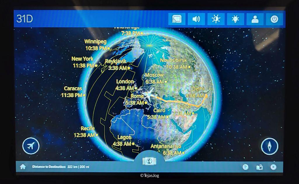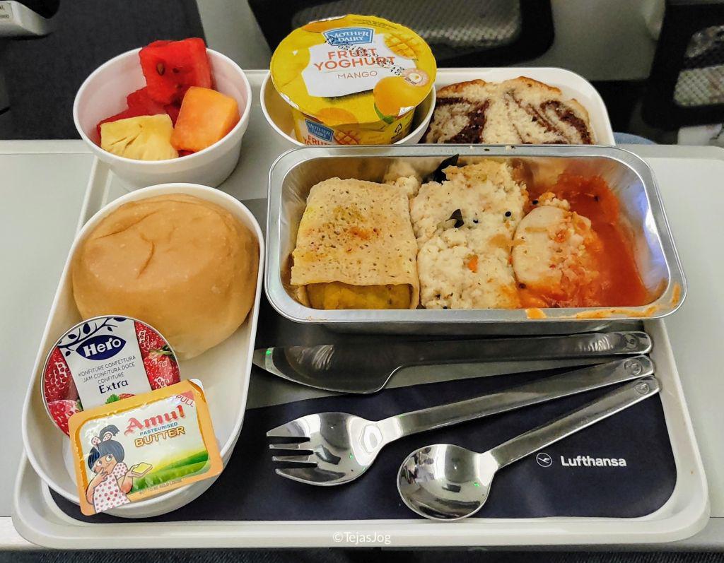 After take off there was a beverage service along with a small snack. I saw Jurassic World Dominion on the Inflight Entertainment System and then tried to get some sleep. Eventually, I took the extra blanket and pillow from the middle seats and actually slept on the floor in front of these 3 seats. This was the first time I had done this, but it let me be flat and allowed me to get at least a few hours of sleep. My wife was able to sleep on the 3 seats with her legs across from the immovable armrest. Before landing, there was breakfast service. I think there was no meal choice and everyone got the Indian vegetarian breakfast. The cabin was being prepared for landing and we were running behind schedule.