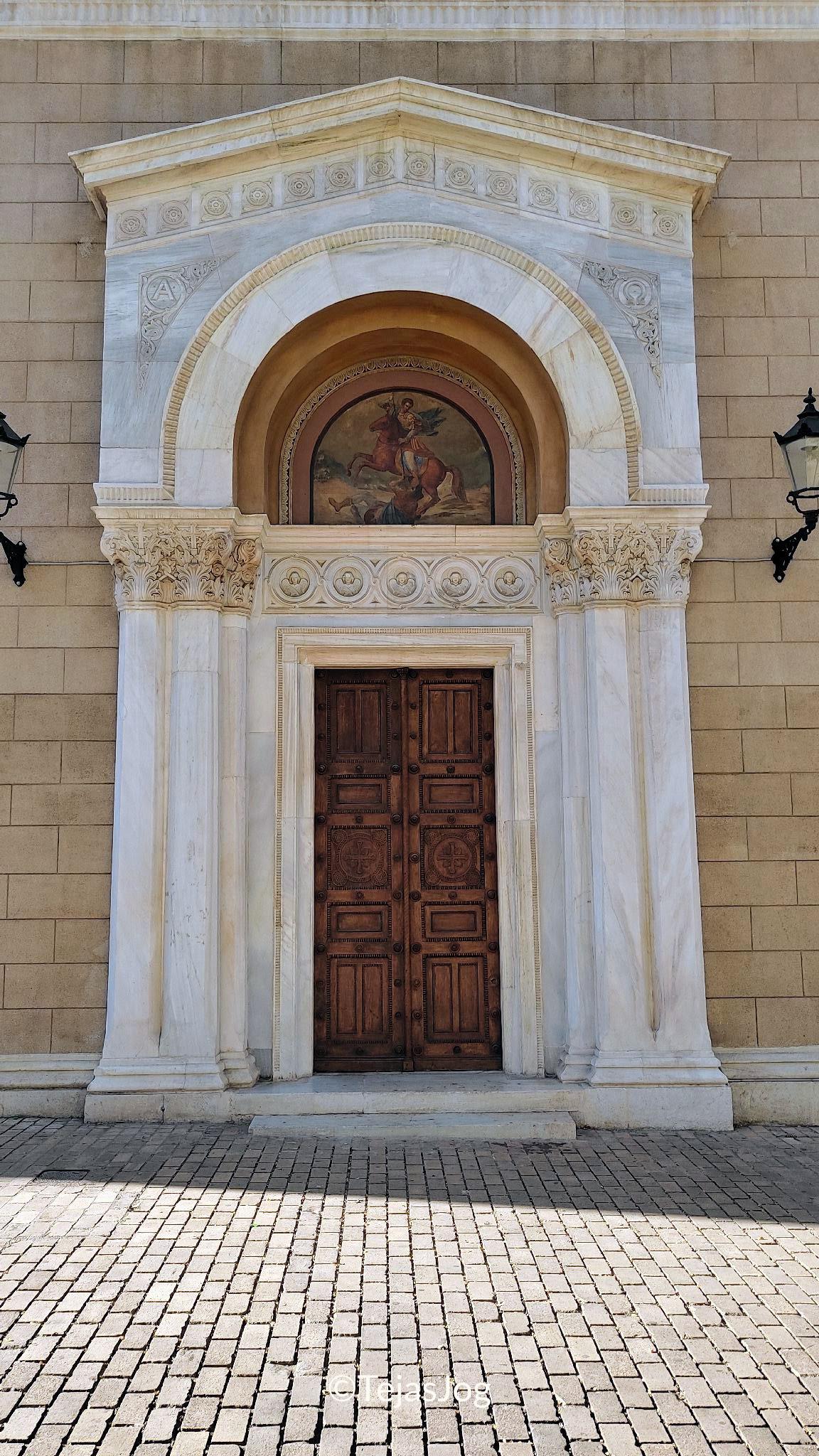 The church was a mixture of Greco-Byzantine and neoclassical architecture. The entrance had an intricate mural above the main door. There was also a large courtyard in front of it which had a Statue of Archbishop Damaskinos Papandreou.