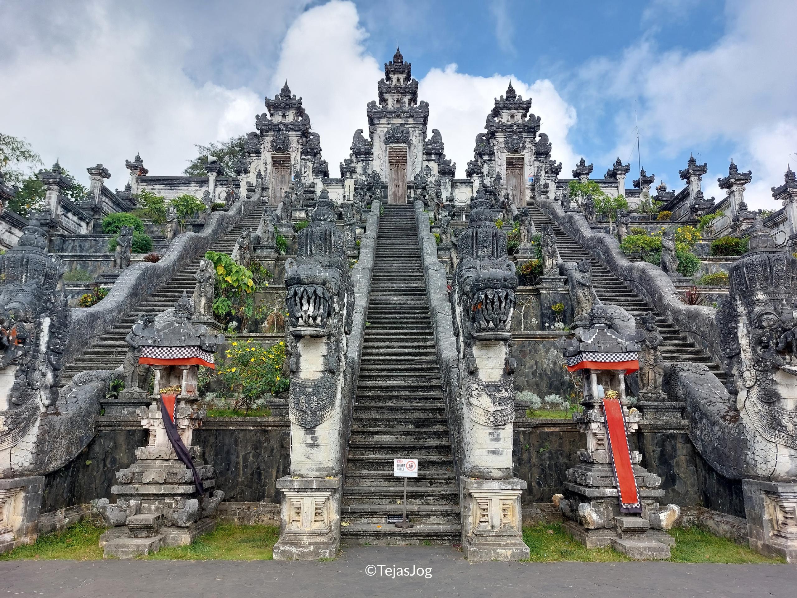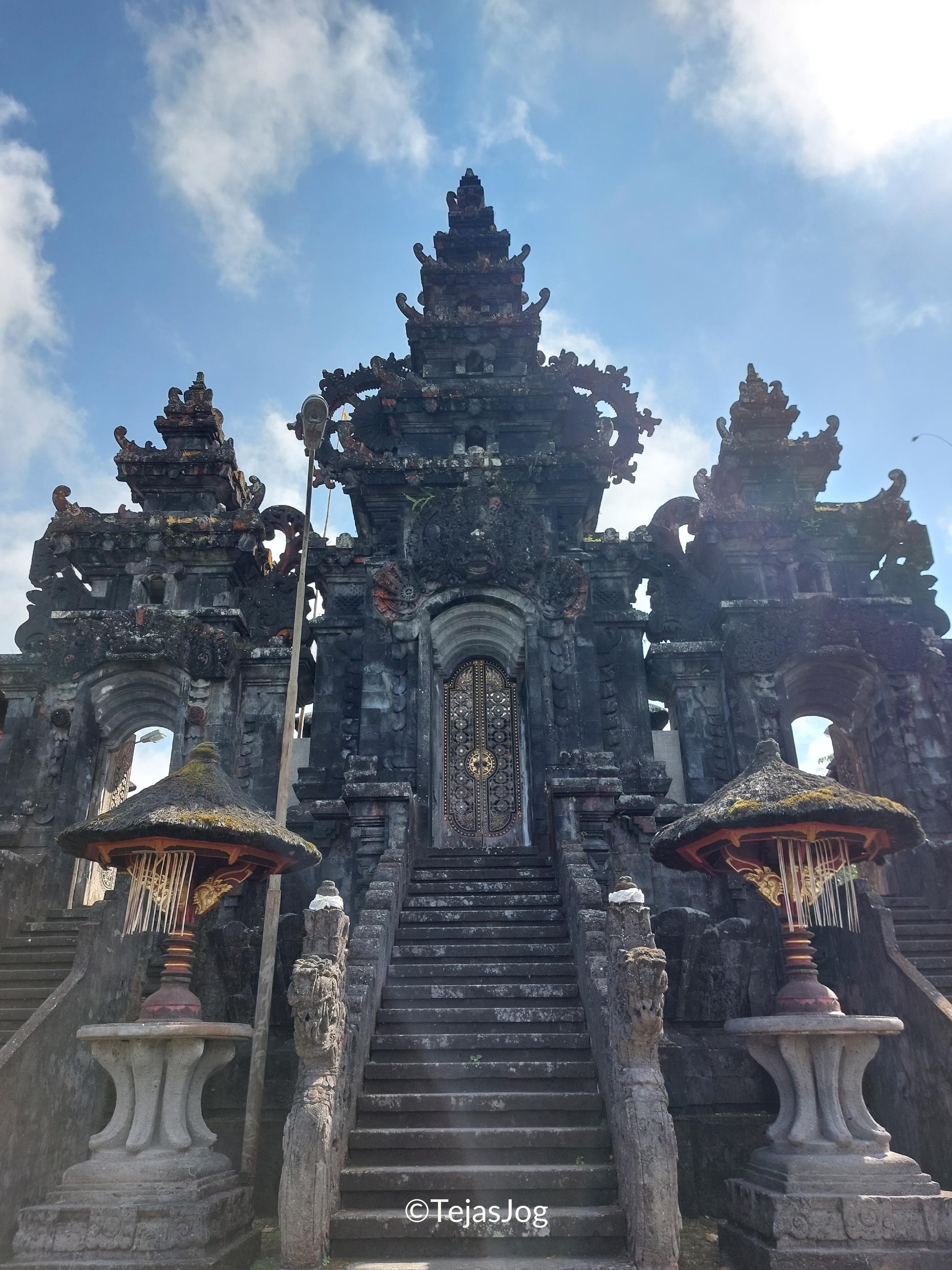 We then headed to the Temple of Penataran Agung Lempuyang. We climbed uphill and had to park our car in a common lot, from where there was separate transport to the temple. The entrance to the temple and the ticket for the shuttle bus cost around IDR 110,000 and IDR 90,000 for the two of us, including the rental sarongs. When we reached the complex of hillside Hindu temples, we saw a huge line with token numbers for getting a photo at the famed “Gates of Heaven” with Mount Agung in the background.