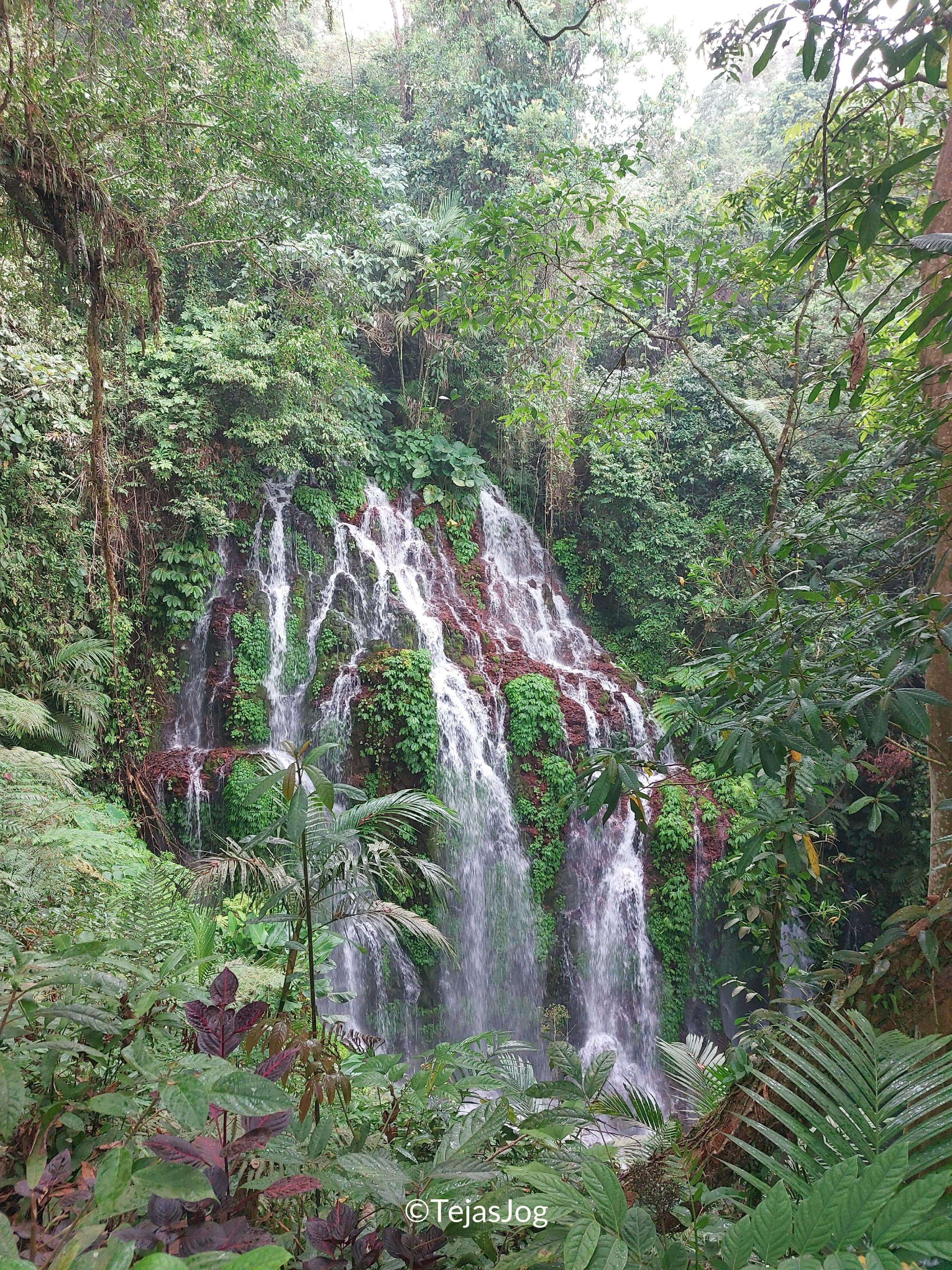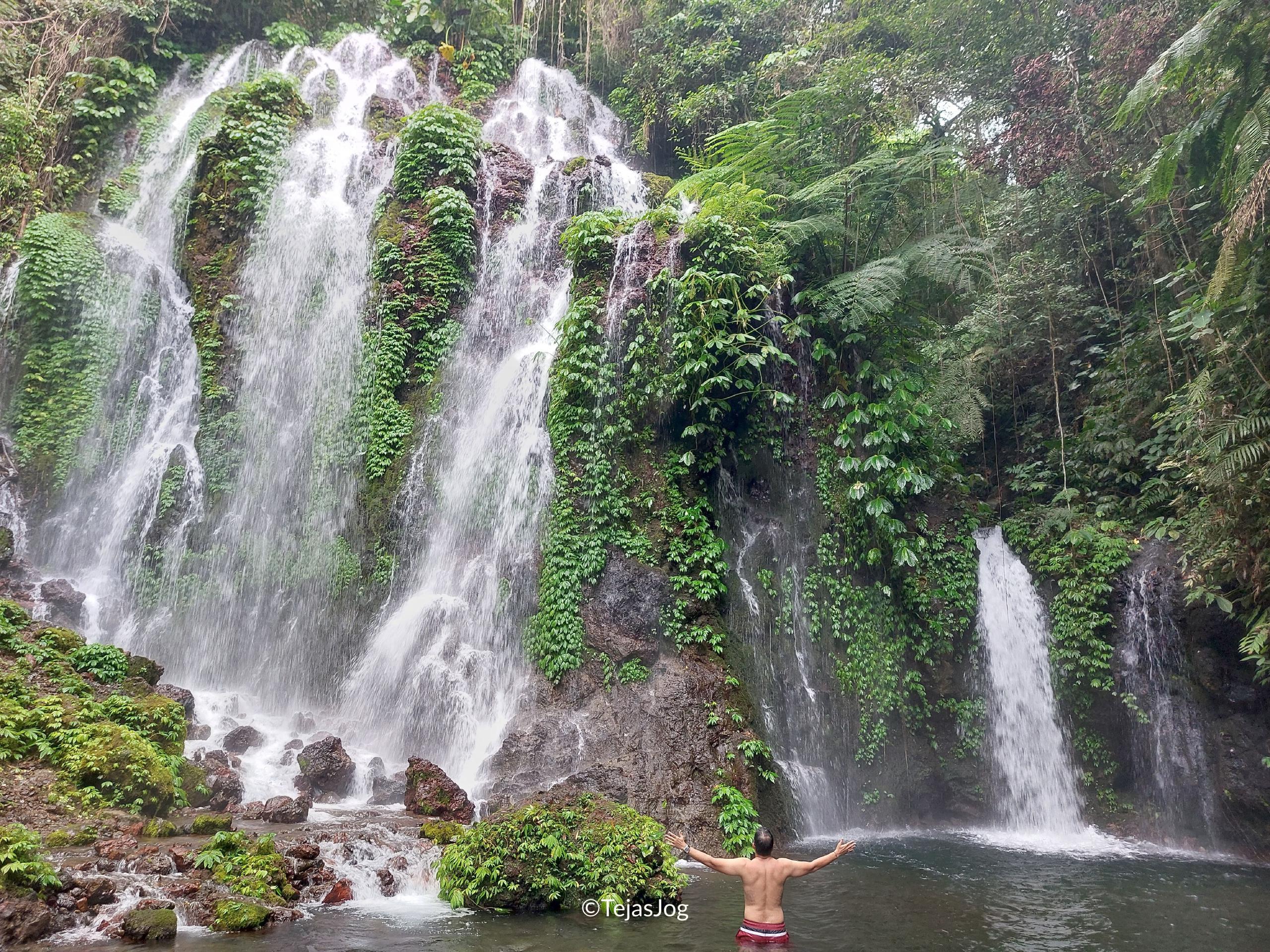 Our next stop was the Banyumala Waterfall. This is not a very popular place for tourists to visit. We had to park at the top, and it was about a 25-minute walk down to the actual waterfalls through lush plantations. The entrance fee was IDR 80,000 for both of us, and there was also an option to take a motorcycle taxi down and up for IDR 25,000 and IDR 30,000, respectively. We saw a few people walking back up as we walked down, but there was hardly anyone there. We first went to the bigger of the two waterfalls. It was a split waterfall in the middle of a jungle, forming a pool at the bottom. Although the water felt cold at first, it was very refreshing to soak under the cascades and swim in the jungle pool. The other waterfall was smaller but nice as well.