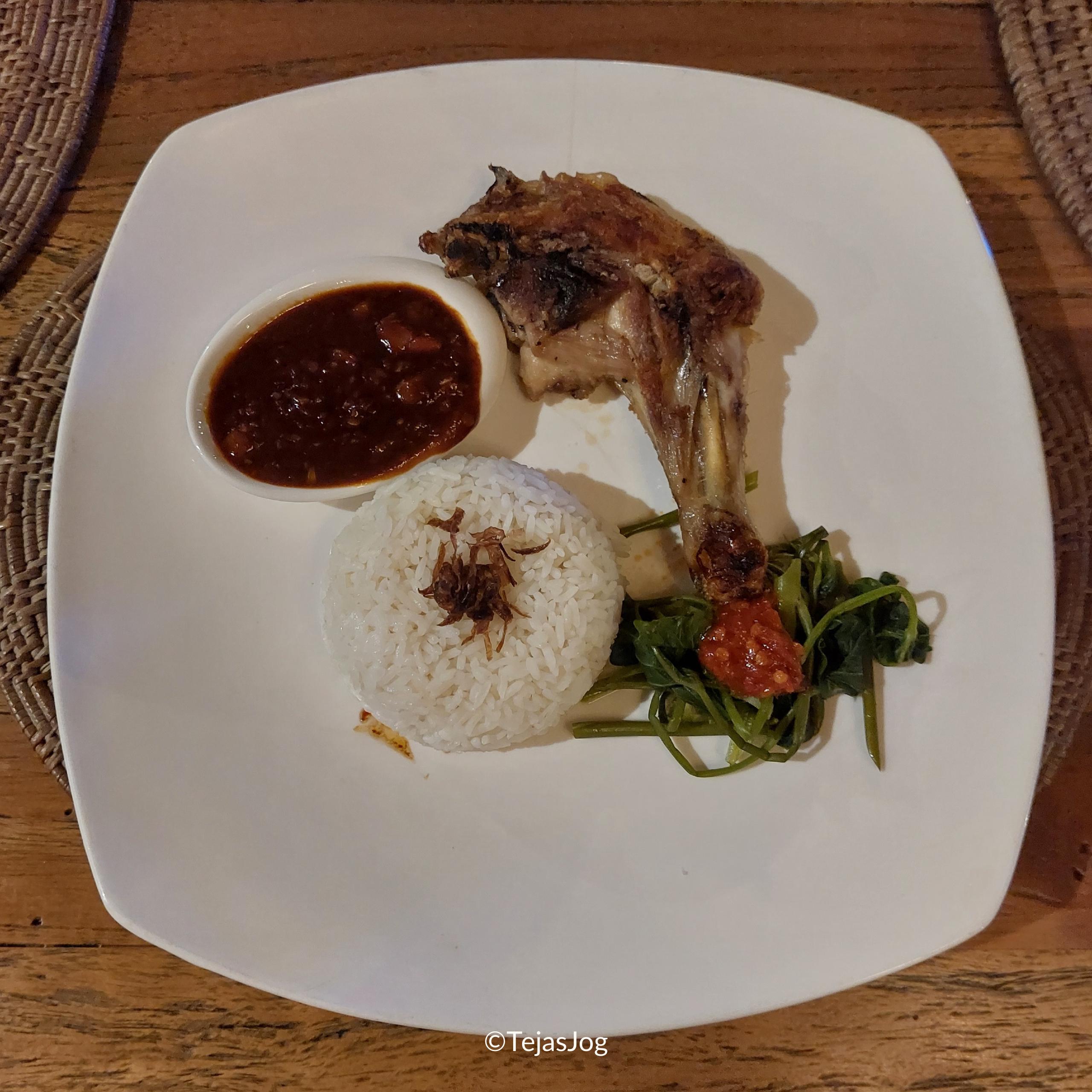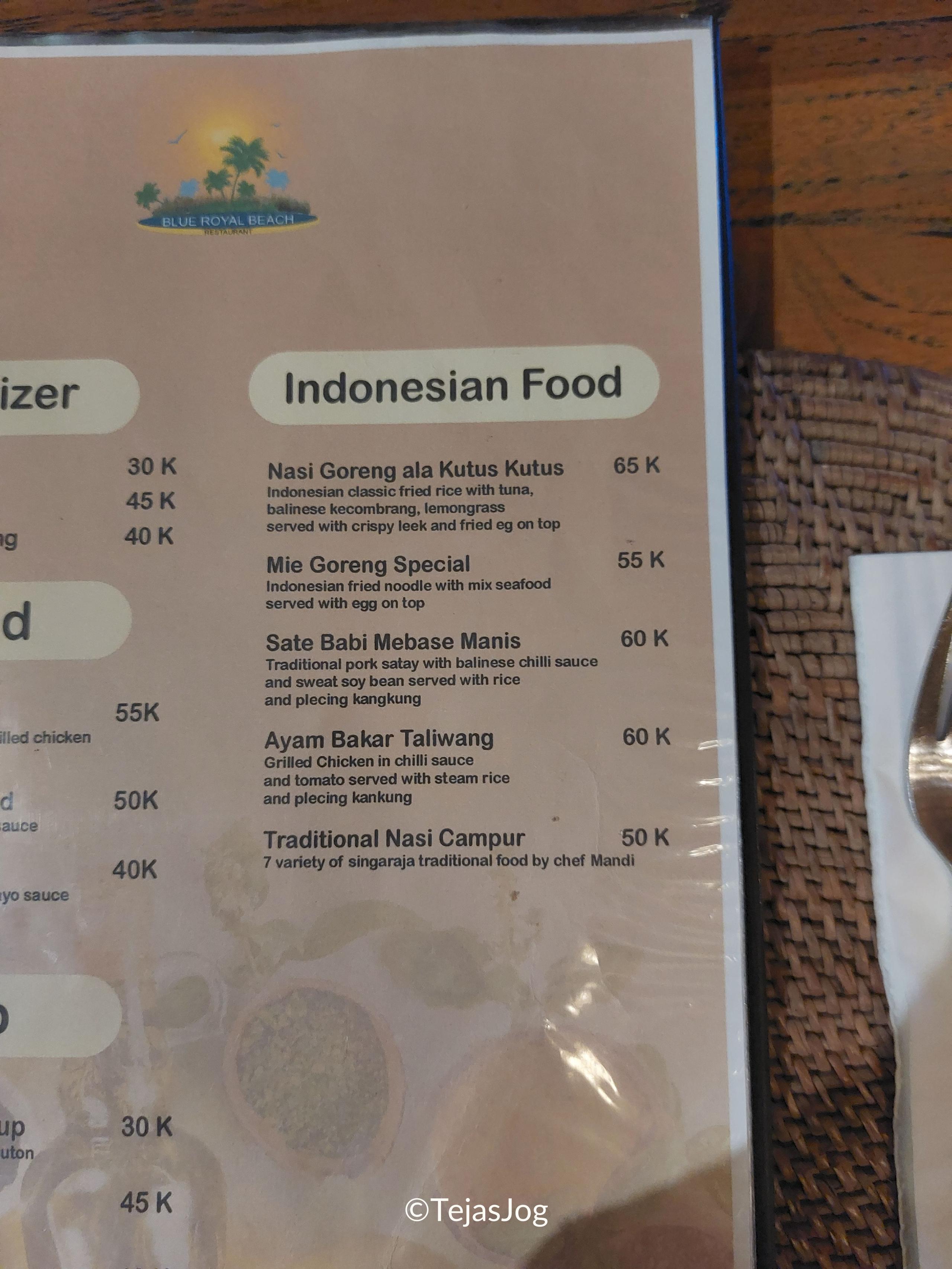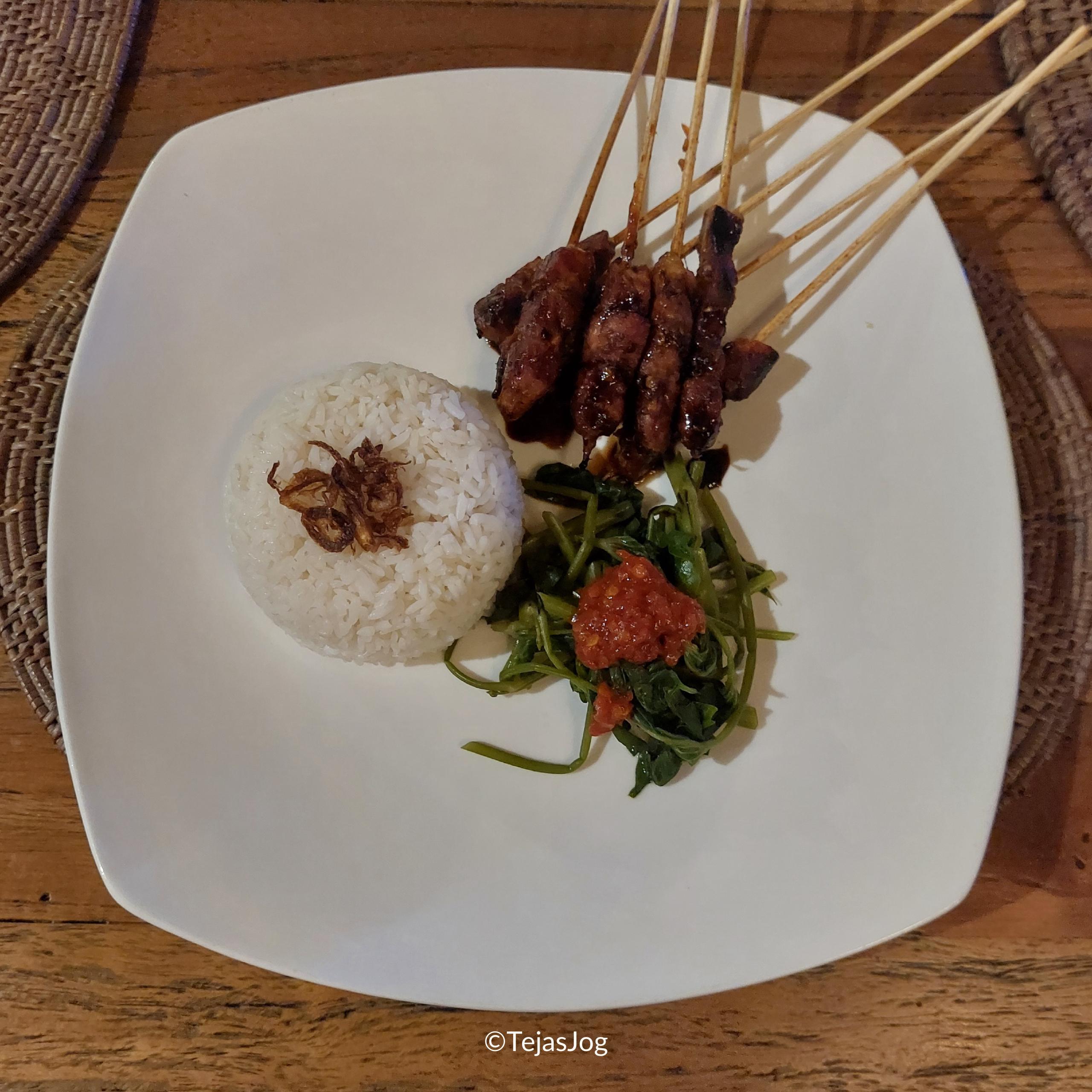 For dinner, we decided to go to the Blue Royal Beach Restaurant in the resort for a relaxed meal. We ordered Sate Babi Mebase Manis and Ayam Bakar Taliwang along with Traditional Nasi Campur. After dinner, we walked back to our room and called it a night.