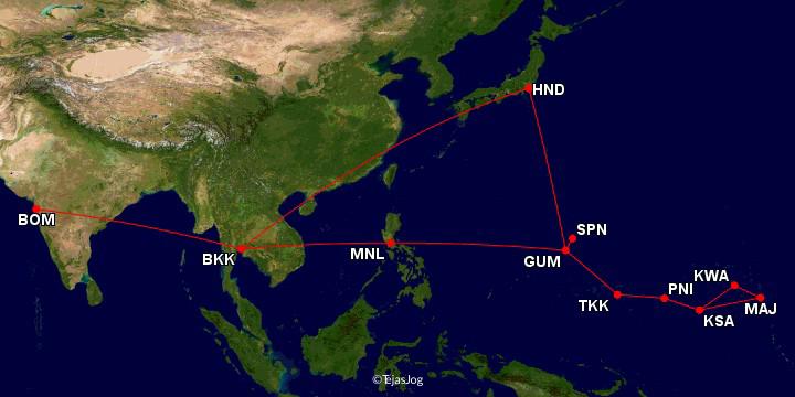 Our first flight would be on Thai Airways on Saturday 28th September leaving Mumbai at 11:55 PM and reaching Bangkok at 05:35 AM. There we would connect to a Thai Airways flight at 07:25 AM reaching Manila at 11:45 AM. We had a long layover in Manila for 10 hours 25 minutes. That night we would fly United Airlines from Manila at 10:25 PM, reaching Guam at 04:15 AM and onwards at 6:50 AM, reaching Majuro at 07:20 PM.