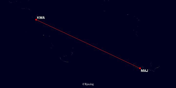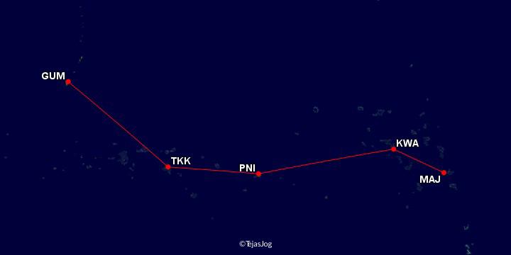 The fifth segment of the flight was from Kwajalein at 5:35 PM reaching Majuro at 7:20 PM. We encountered lots of rain on our way. We could see the lights of Majuro as we got closer to the ground and then suddenly we picked up speed again. Our pilot annouced that we had missed the approach and would now attempt landing from the other side. The second time we landed as expected and deplaned. The flight would continue to Honolulu HNL from Majuro.