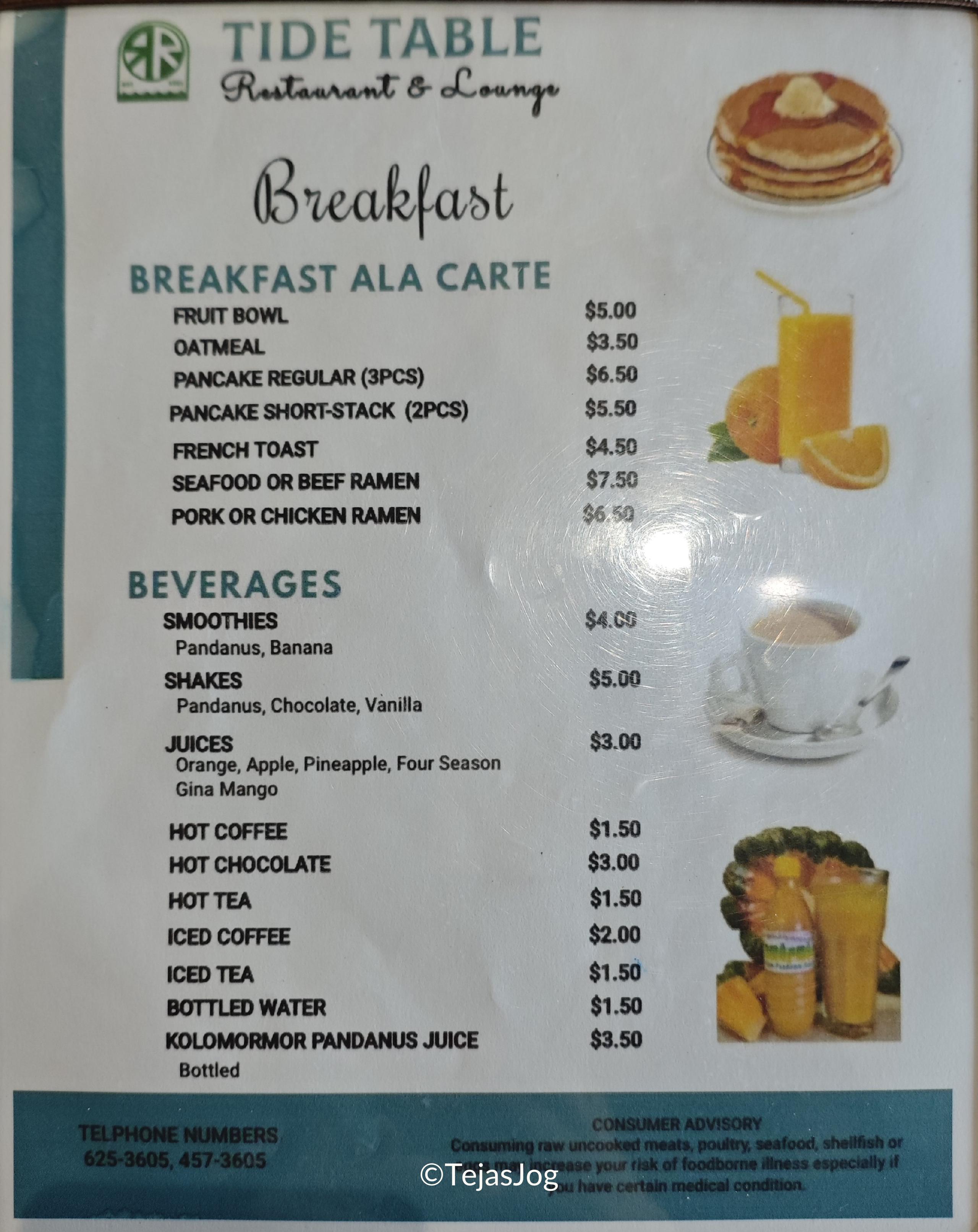 We checked out of our Airbnb and left most of our luggage there, as we planned to return the following day. Our goal for today was to spend the day and stay overnight at Eneko Island. We started our morning with a hearty breakfast at the Tide Table Restaurant & Lounge at Hotel Robert Reimers.