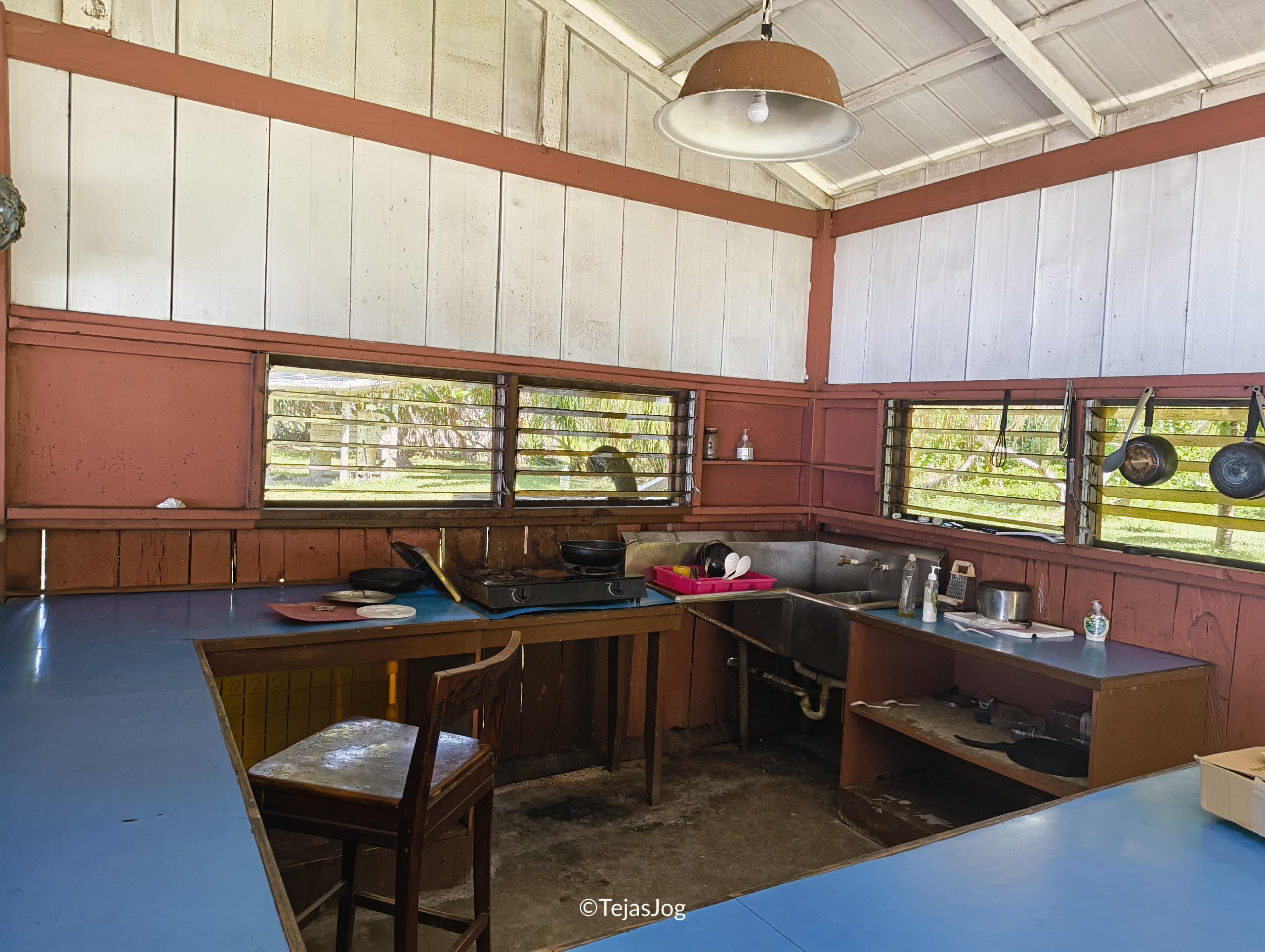 There was a shared kitchen next to the main cottage where we could prepare meals. It was basic but included all the necessary amenities and utensils, such as a gas stove and counter seating. As Eneko Island has no restaurant, we had to bring all our food and water for the two days with us on the boat. We brought some “heat-and-eat” meals from home for this purpose.