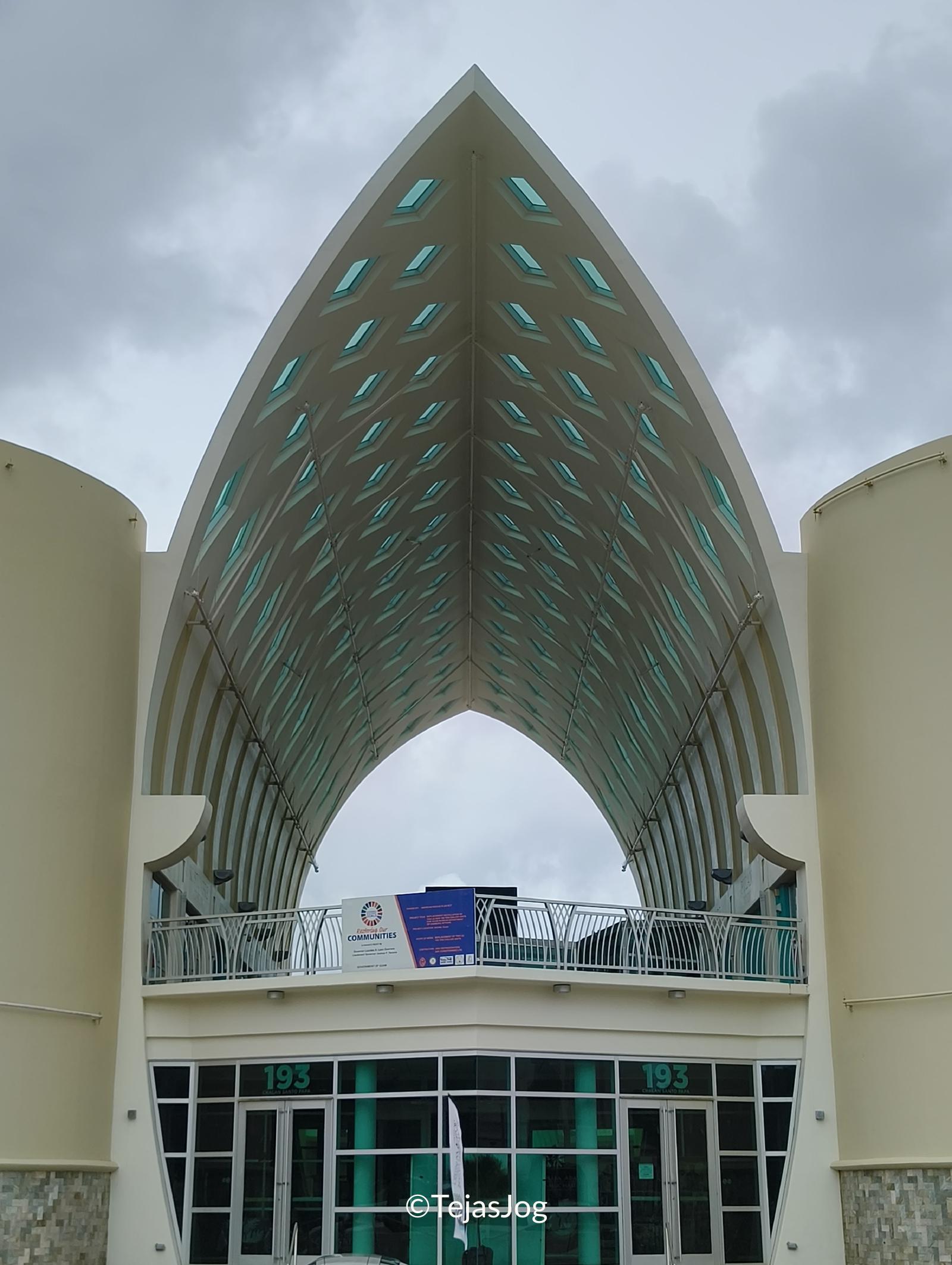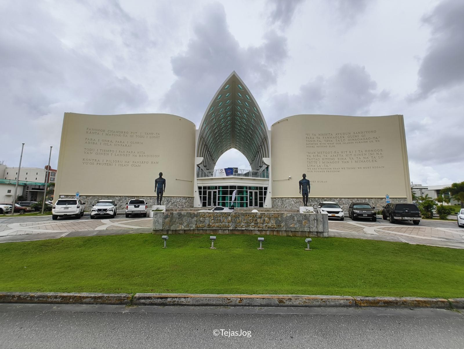 The Guam Museum, across from Plaza de España, is a modern architectural landmark designed to look like a giant Latte Stone or an open book.