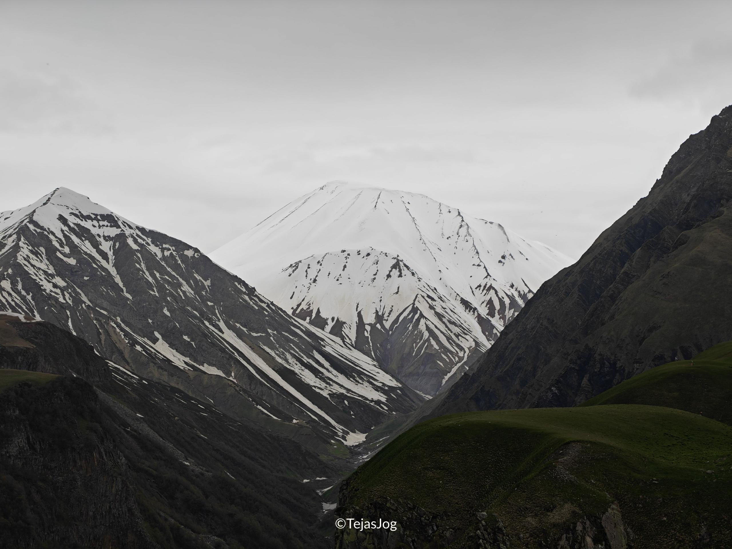As we drove towards Stepantsminda, we saw a long line of trucks waiting on the opposite side heading towards Tbilisi. They were likely coming from the Russian border, which was not far away, waiting for paperwork, clearance, or traffic restrictions.