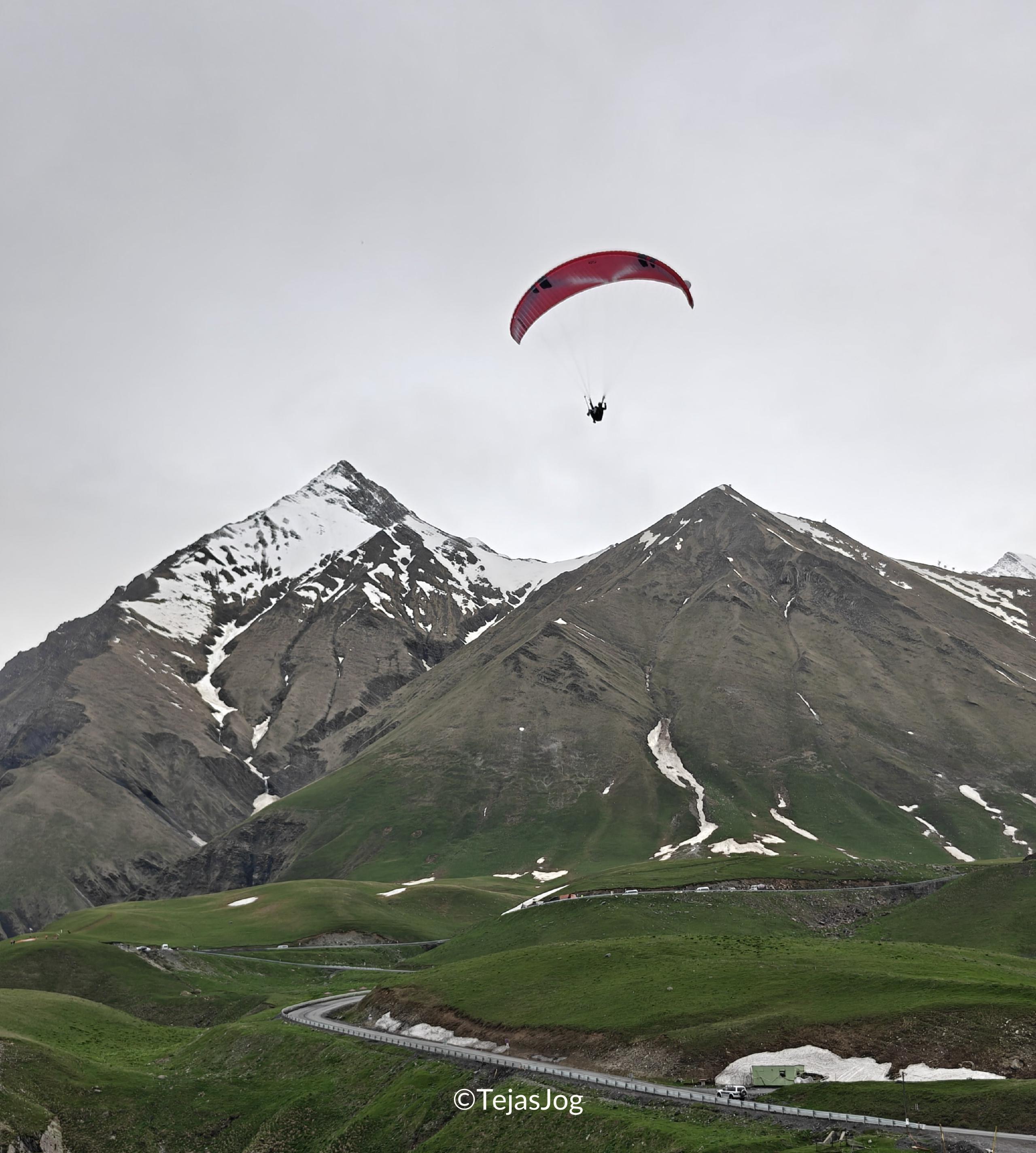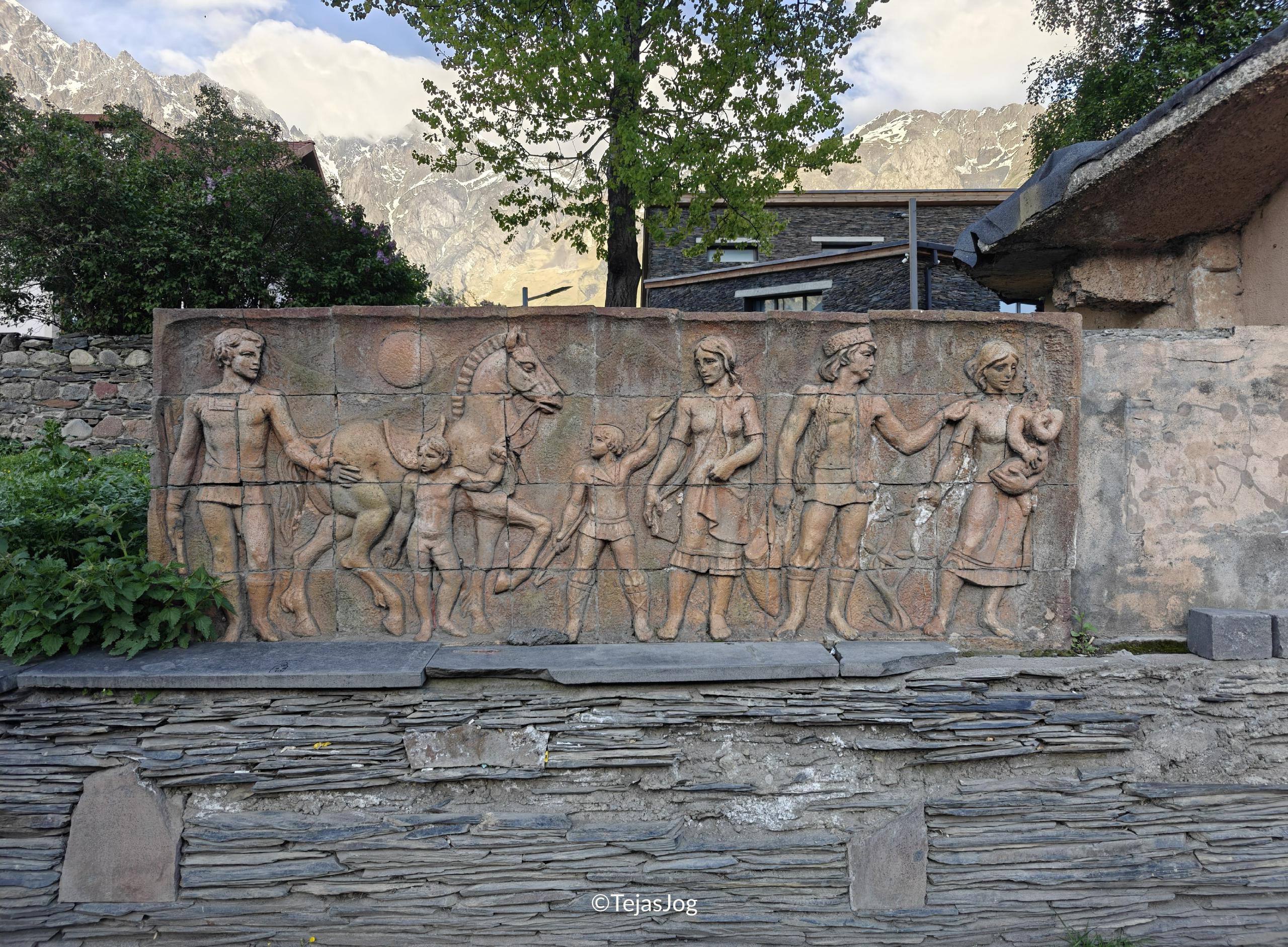 Our next stop was the Georgia-Russia Friendship Monument. It is a large semi-circular structure with murals on the inward-facing walls, overlooking the valley and mountains. The boys saw snow for the first time there, and we walked to a nearby patch so they could see it up close. It wasn’t pristine, but it was snow nonetheless. There was also an option for paragliding, but we didn’t have enough time to try it.