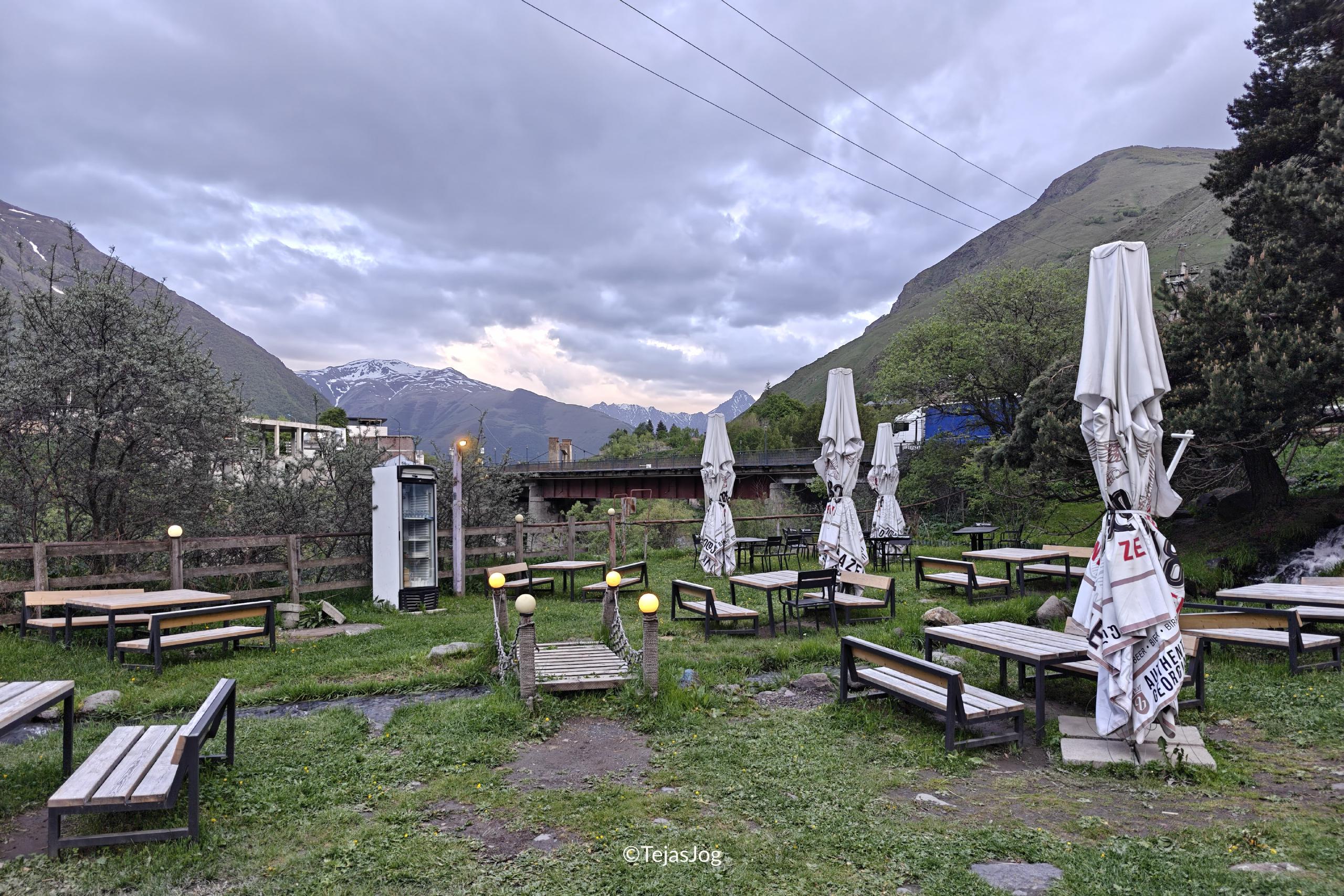 We reached Stepantsminda in the late evening, checked into our hotel, and parked the van. The walk into the town center was all downhill. We quickly realized that it would be entirely uphill on the way back after dinner. To avoid the climb later, I walked back and fetched the van while the rest of the group waited in the town center and shortlisted a place for dinner.