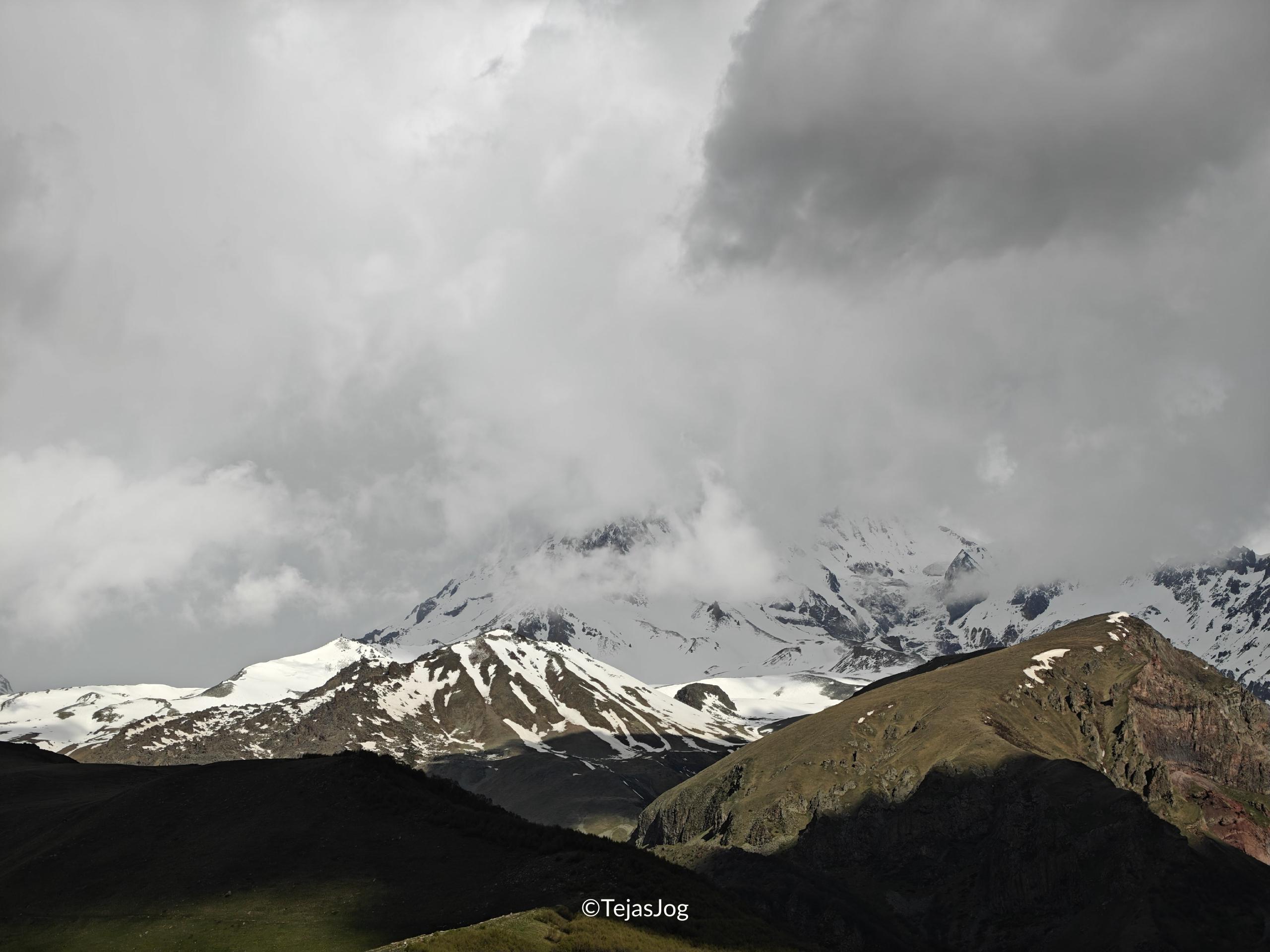 I got up early to see the morning light on Mt. Kazbek from our balcony. It was quite dark but the size of Mt. Kazbeg was evident. As the sun rose, the cloud came in and coverered the peak.