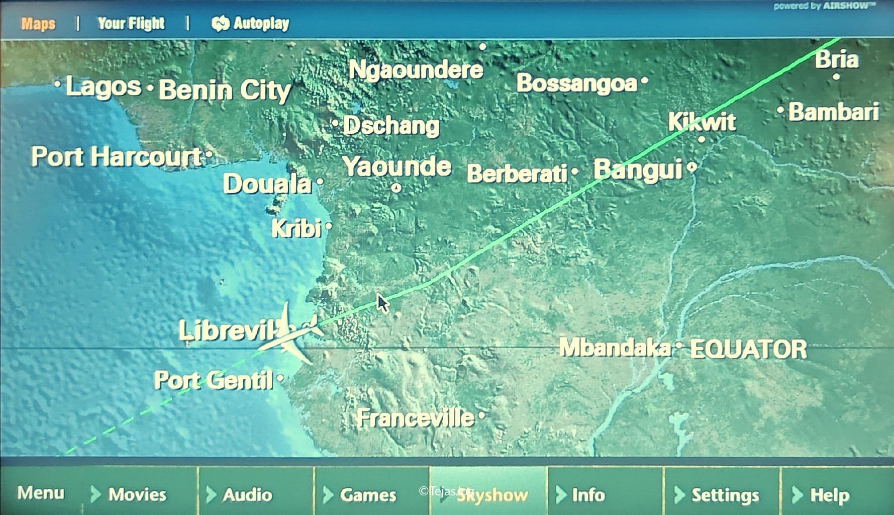 We flew across Africa and left the mainland around Libreville and shortly after crossed the equator from the northern hemisphere to the southern hemisphere. With that, we began the long crossing of the South Atlantic Ocean. We saw land the next time as we approached the coast of Brazil. There was another meal service before landing, and we touched down in Sao Paulo on time.