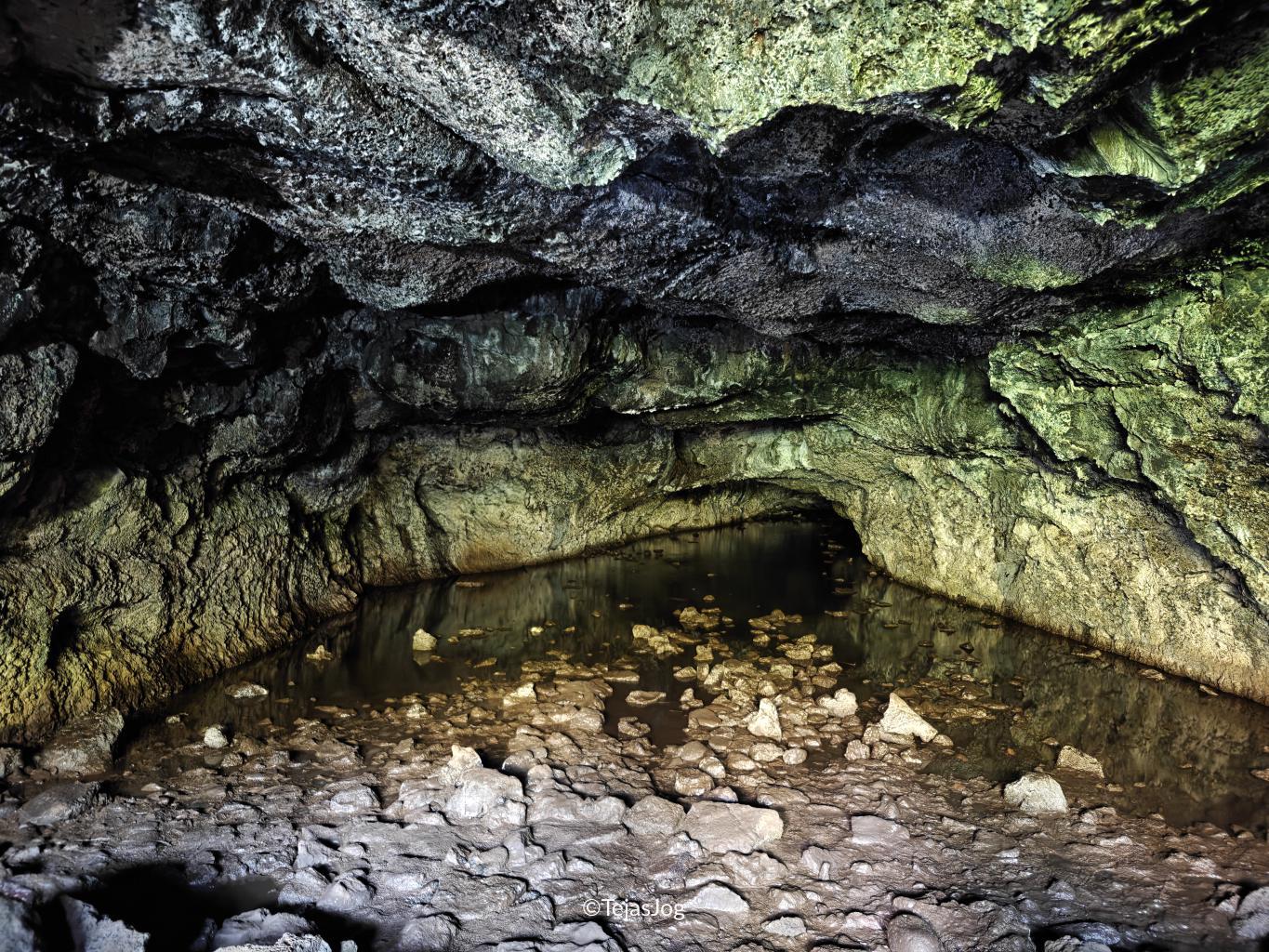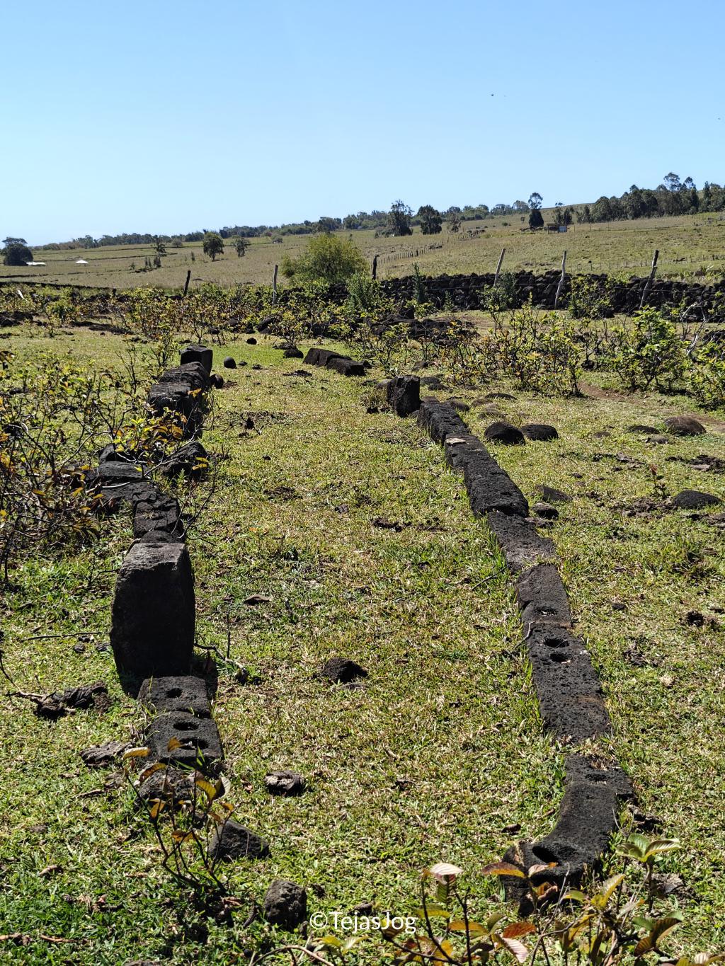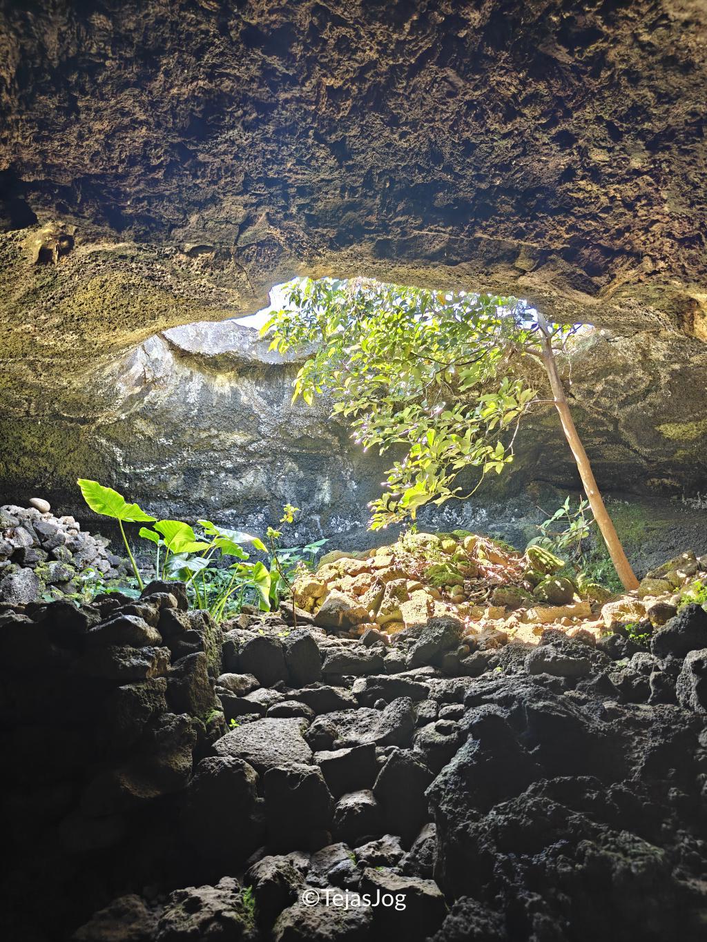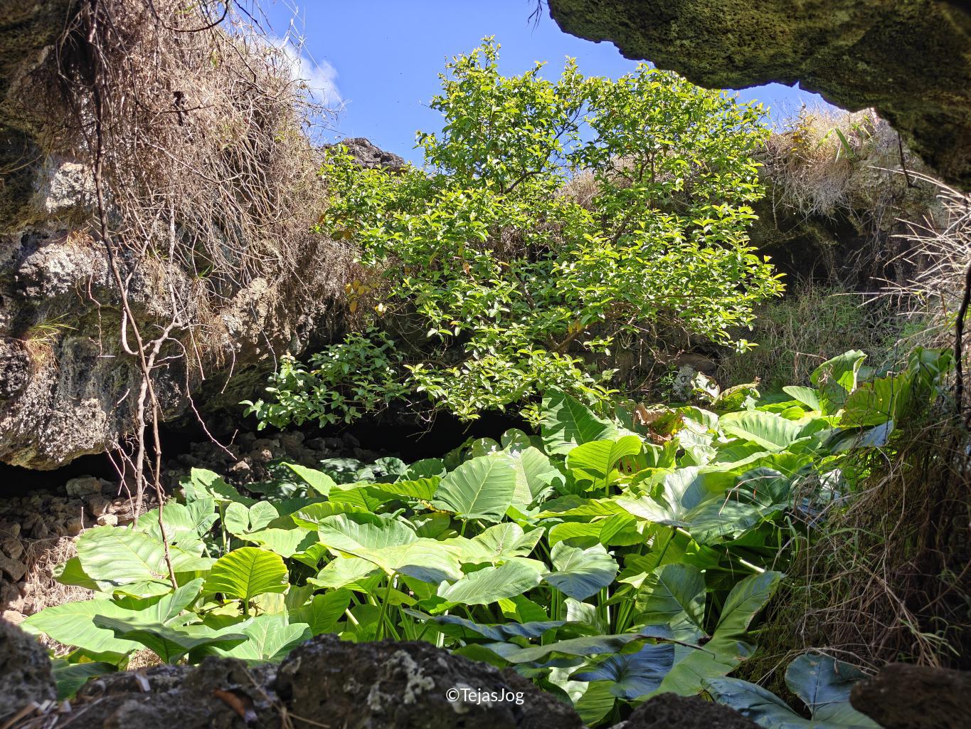 We waited at the Mahinatur office for some time for other passengers to arrive and after some time our guide and driver picked us up in the bus and we were off. Our first stop was Ana Te Pahu. It was a volcanic cave used as a refuge and storage, surrounded by traditional gardens with native plants. We could see the stone blocks which were once the foundations of a traditional home. We also walked through the cave to see Banana and Guava trees which thrived in the part of the cave that was shielded from the sides but open to air. These areas protected the trees from the salt in the breeze but gave them light. There were also some parts of the cave where fresh water had collected.