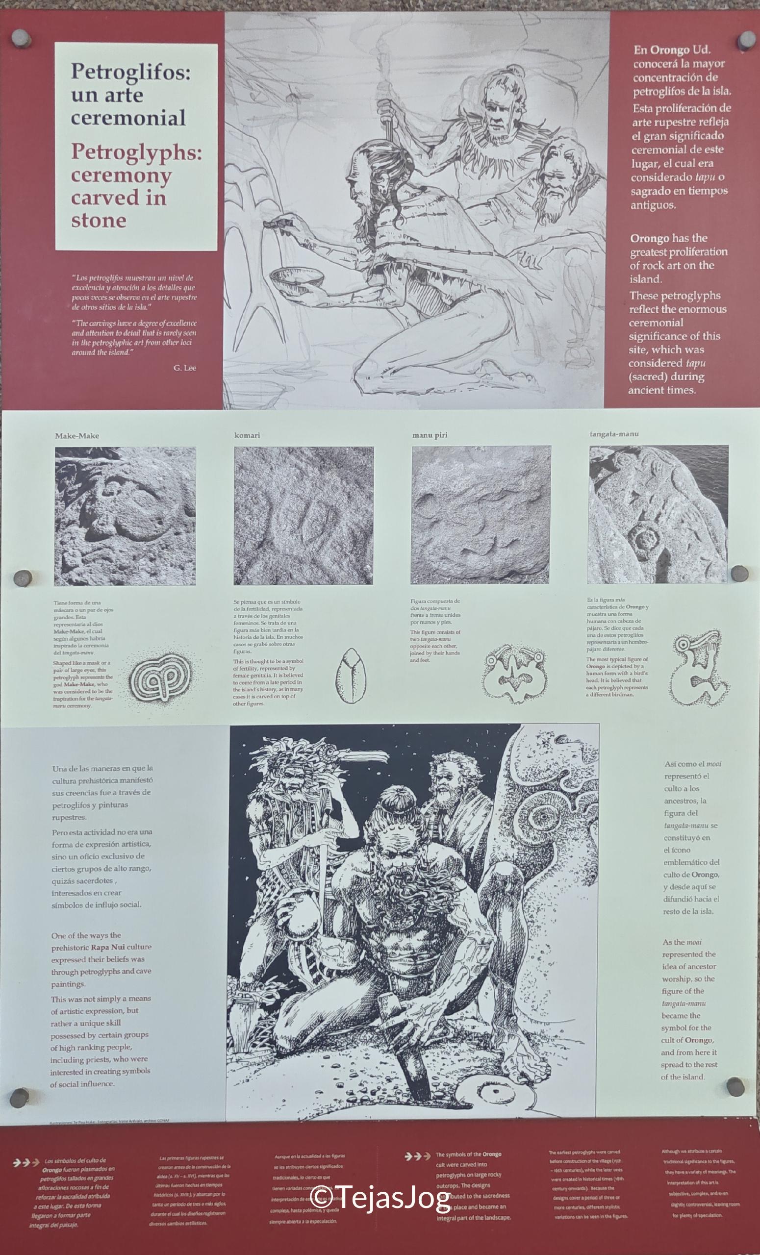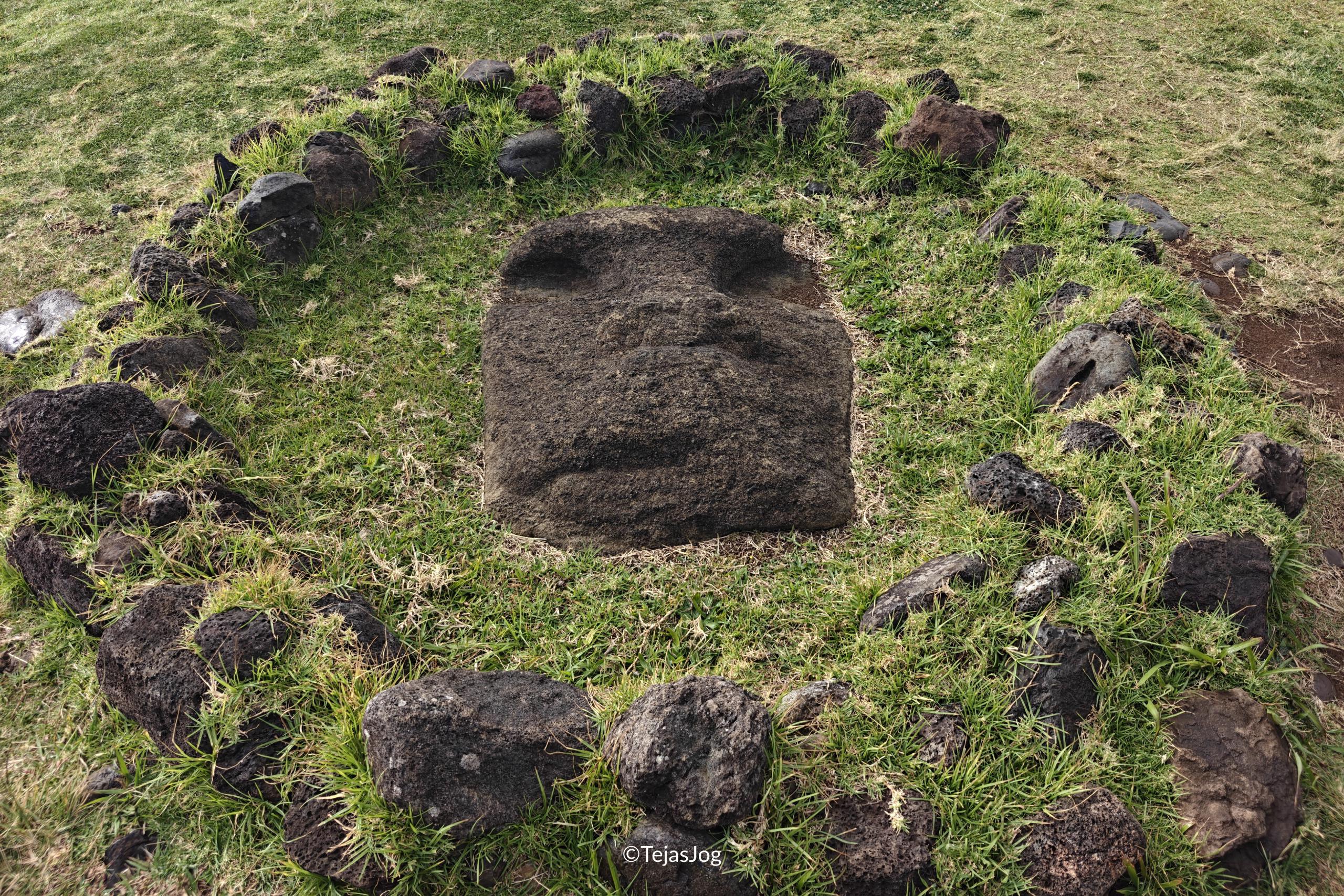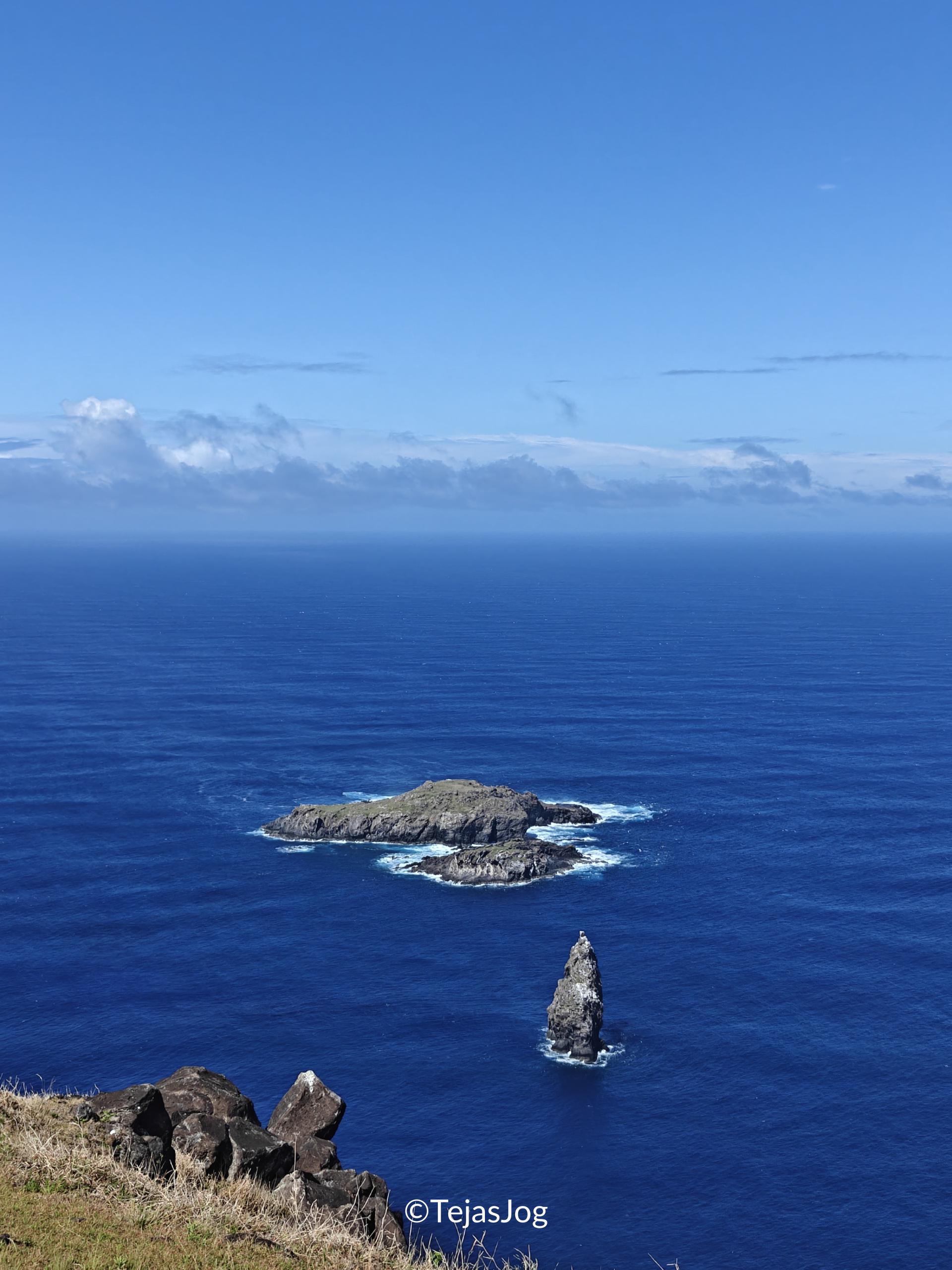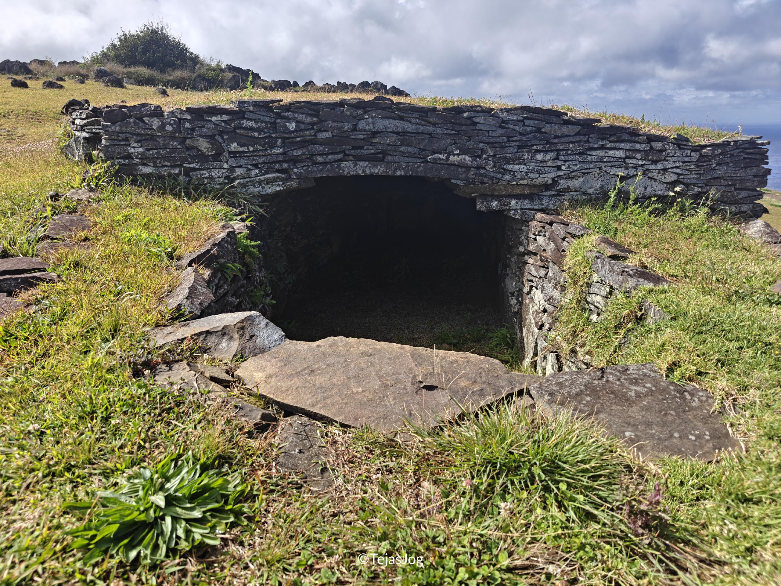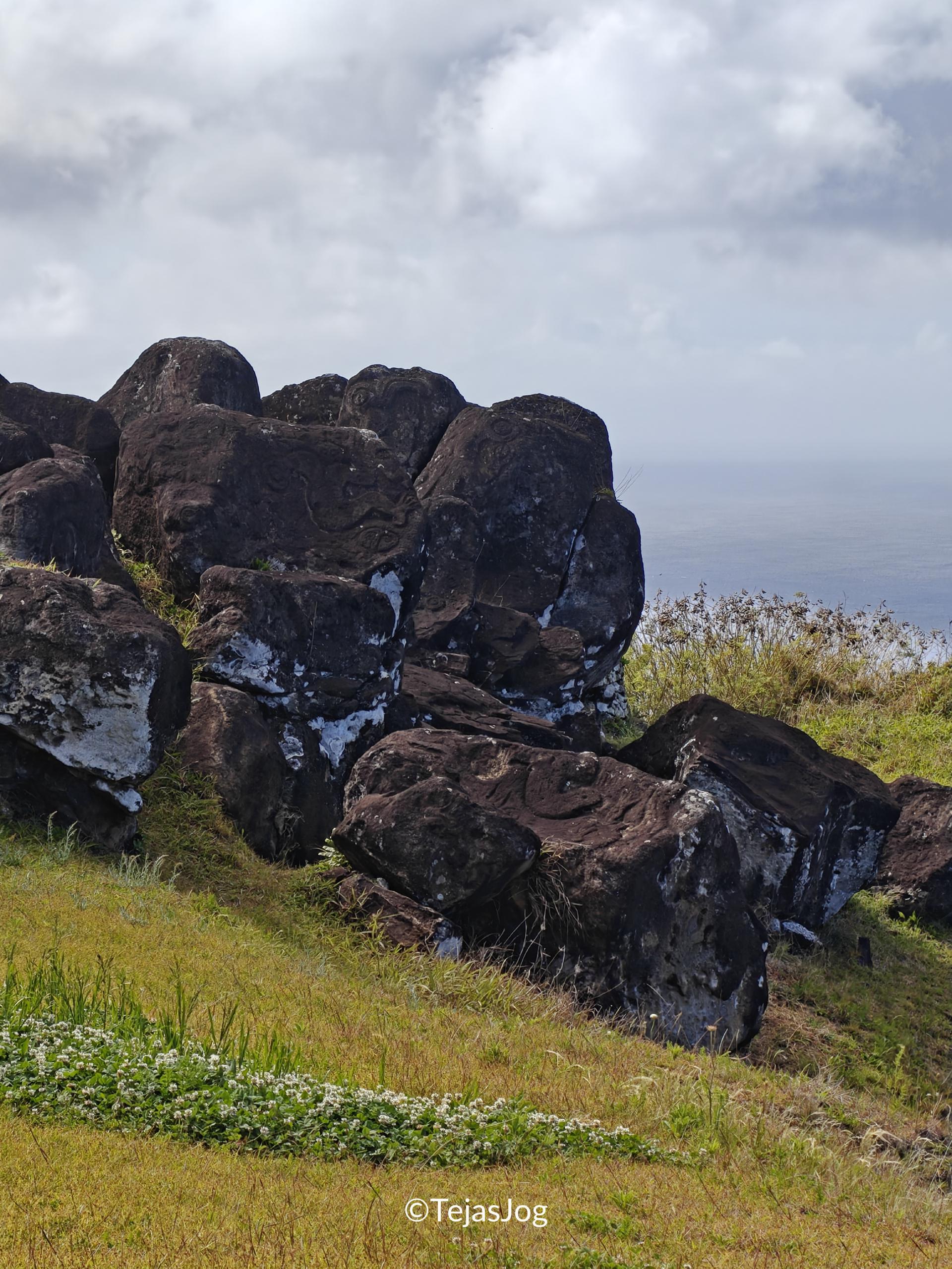 Then we drove toward the hill, parallel to the airport runway as we climbed. The next stop was Orongo Village. This was a restored ceremonial village of the Tangata Manu cult. We saw the islets of Motu Nui, Iti, and Kao Kao. This group of islets, located off the coast of Easter Island, is famous as the site of the annual Birdman competition.