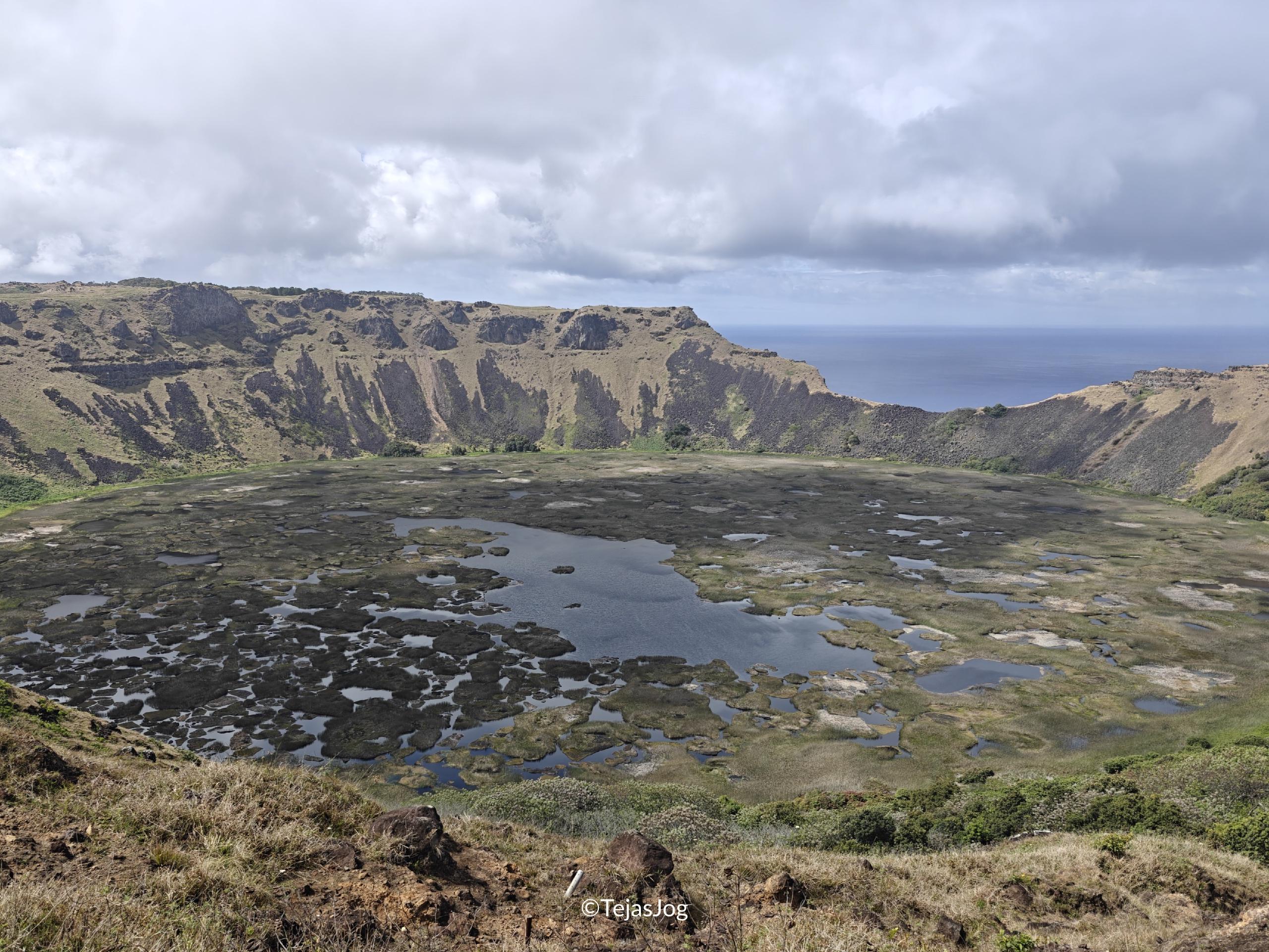 The Orongo Village was on the edge of Rano Kau, an extinct volcano in the southwest part of Easter Island. The crater is almost a mile across and has its own microclimate. It looked quite different from the landscape and vegetation seen on the rest of the island. On the way back, we stopped at another vantage point to get more views of the crater.